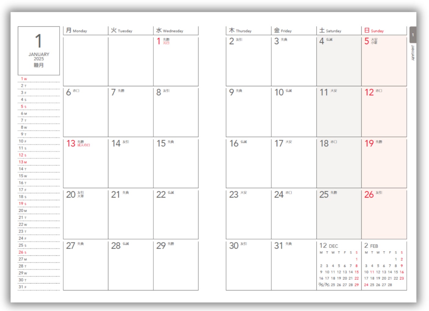 また、月間カレンダーと週間カレンダーはメモ欄も豊富に登載。