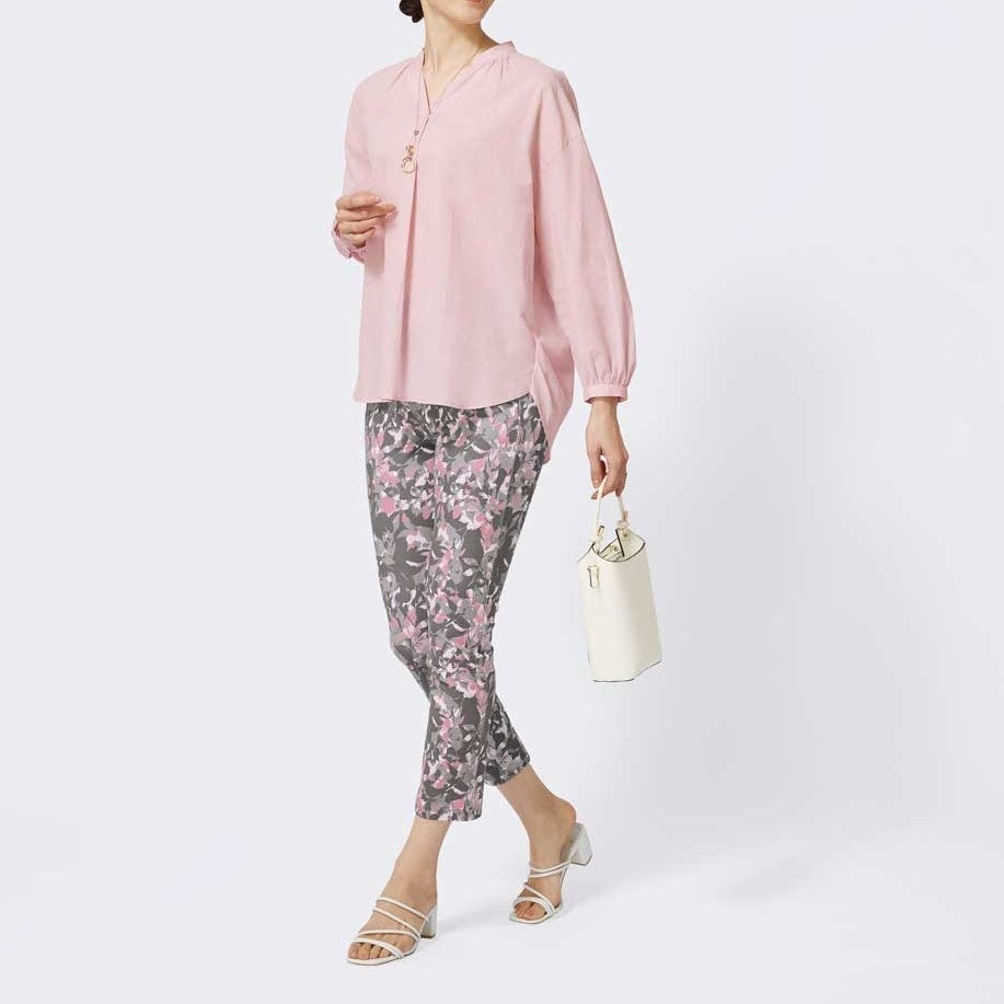 【商品名】マルチストレッチシルエットリーフ柄プリントパンツ