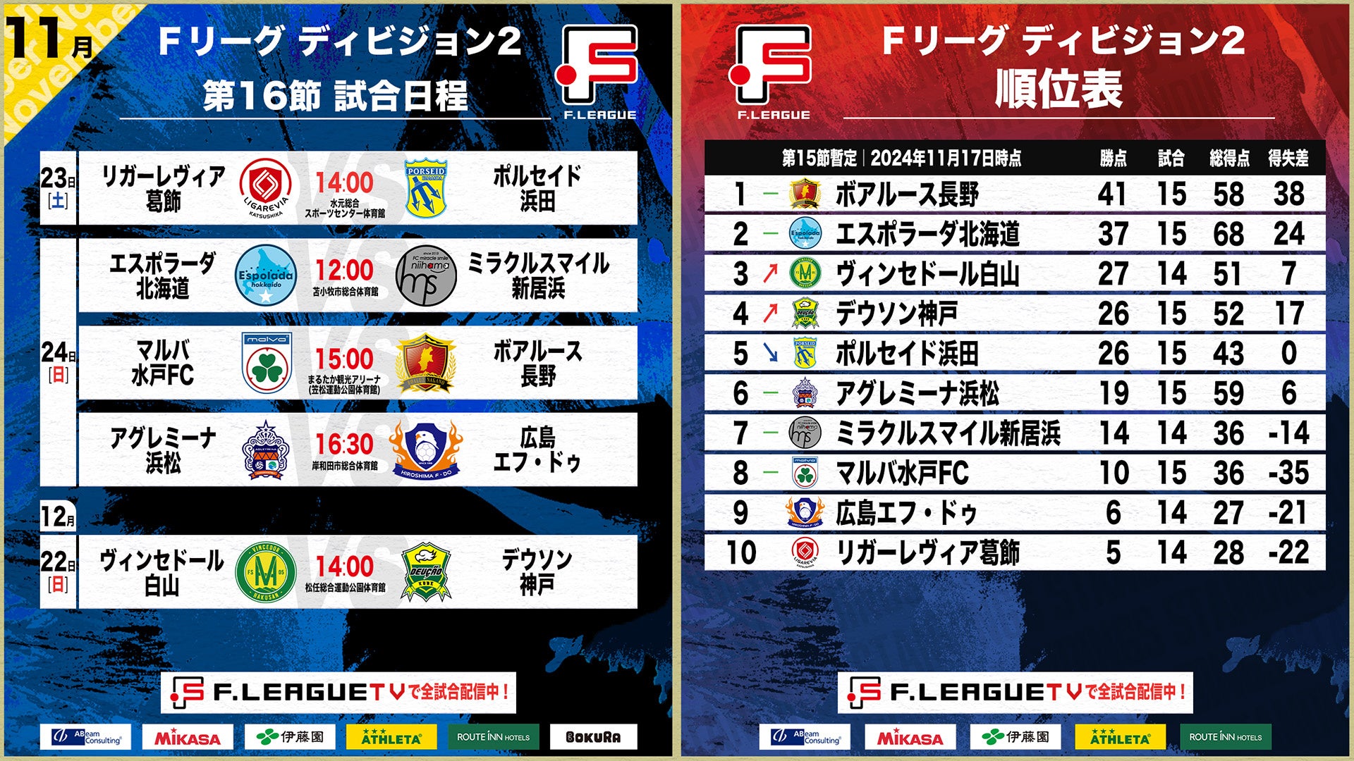 【F2第16節|11月23日〜24日 試合情報】会場情報/チケット情報/注目ポイントは?【Fリーグ2024-2025 ディビジョン2】今こそ最高のフットサルを