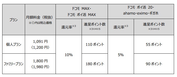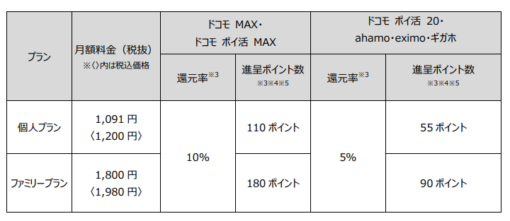 本特典では、本サービスをご契約かつ「ドコモ MAX」「ドコモ ポイ活 MAX」「ドコモ ポイ活 20」「ahamo」「eximo」 ※3 「ギガホ」※4 をご契約のお客さまを対象に、本サービス月額料金(税抜)の最大 10%のdポイント(期間・用途 限定)を進呈※5※6 します。