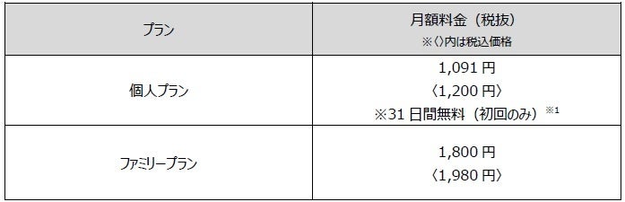 ドコモでの本サービスの取り扱いプランは「個人プラン」「ファミリープラン」となります。「個人プラン」は月額1,200円 (税込)でご利用いただけ、「ファミリープラン」は月額1,980円(税込)でご利用いただけます。また、「個人プラン」 をドコモから初めてお申込みの場合、31日間の初回無料特典を進呈します。