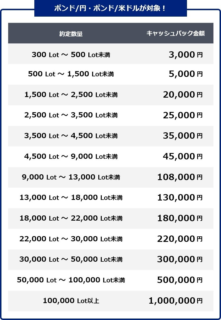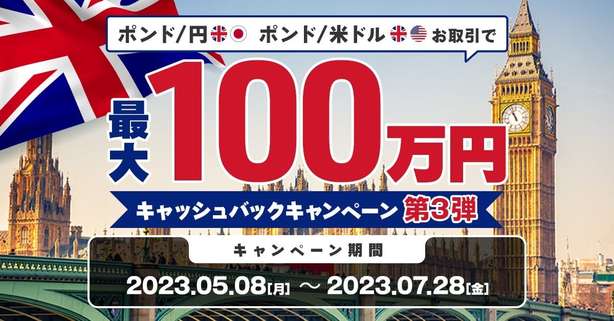 2023年5月8日(月)~2023年7月28日(金)の期間中、FX口座におけるポンド/円またはポンド/米ドル、それぞれの通貨ペアの新規取引の合計数量に応じて最大100万円(各通貨ペアごと)をキャッシュバックいたします。
