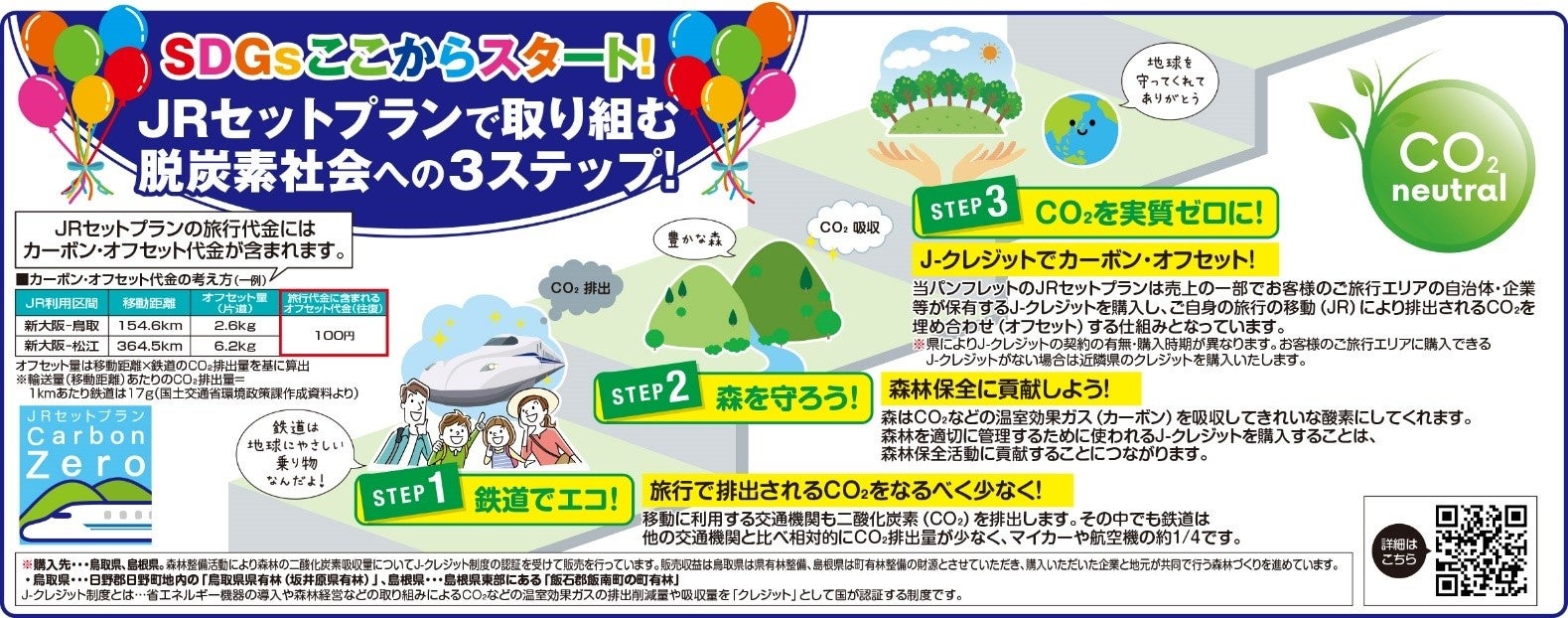 その一環として当社は、旅行での往復の移動により排出されるCO₂を実質ゼロにするカーボン・オフセットプログラム「JRセットプランCarbon−Zero(カーボンゼロ)」をお客様の任意でお申込みいただけるオプションプランとして2021年1月に販売開始しました。今回、脱炭素社会の実現に向け、この取り組みを一層加速させるため、この「JRセットプランCarbon−Zero(カーボンゼロ)」を予め組み込んだ「JRで行くスーパーチャンスCarbon-Zero(カーボンゼロ)シリーズ」京阪神発7商品を新たに発売することとしました。これにより本商品をご利用いただいたお客様は往復の移動により排出されるCO₂が実質ゼロになります。