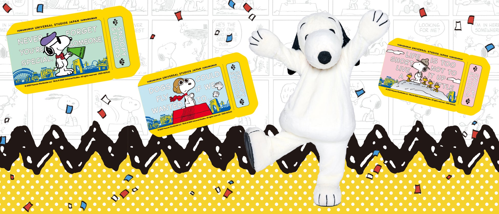 ユニバーサル・スタジオ・ジャパンでは、『PEANUTS』 75周年を記念し『超スヌーピー・フェスタ』を開催中です。スヌーピー・エリアでは、この期間限定の特別な“超スヌーピー”なステッカーを配布いたします。デザインは、全3種類登場します。『スヌーピー・スタジオ』のパワーアップを記念してエリアへの招待チケットをイメージしたオリジナルデザインのステッカーです。コンプリートを目指し、ぜひ何度もこの場所でお楽しみください。