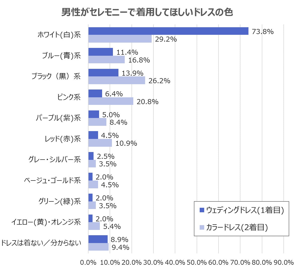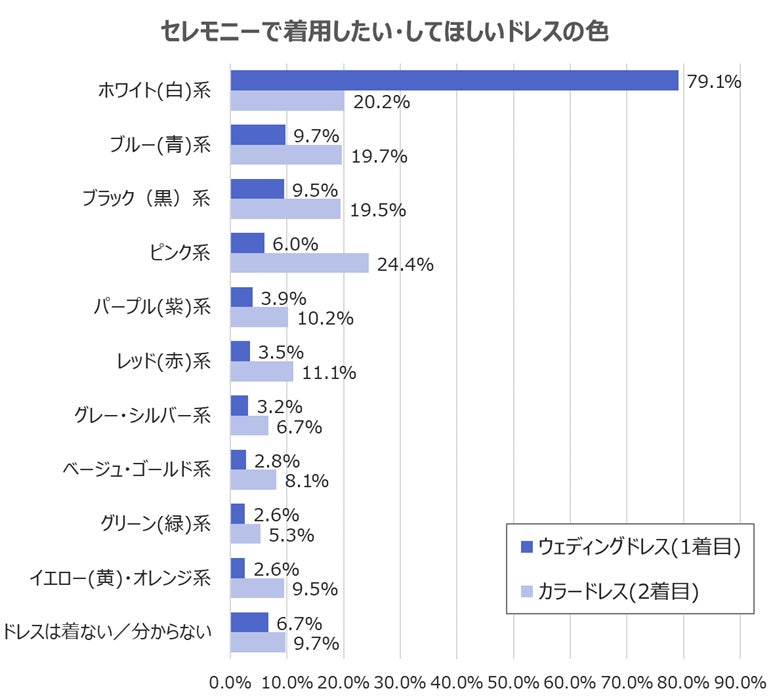 1着目のウェディングドレスで最も人気だったのは「ホワイト(白)系」で、79.1%の人が“王道”カラーを選びました。2位は「ブルー(青)系」(9.7%)でしたが、3位にトレンドの「ブラック(黒)系」(9.5%)がランクインしました。