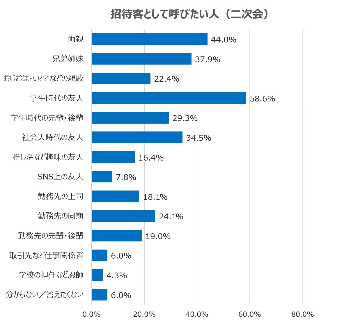 従来は招待することが一般的だった会社関係者については、「勤務先の同期」(14.0%)、「勤務先の上司」(13.1%)、「勤務先の先輩・後輩」(12.3%)と、それぞれ1割程度にとどまっています。昨今では、会社の上司も同僚も“呼びたくない”のがホンネなのかもしれません。