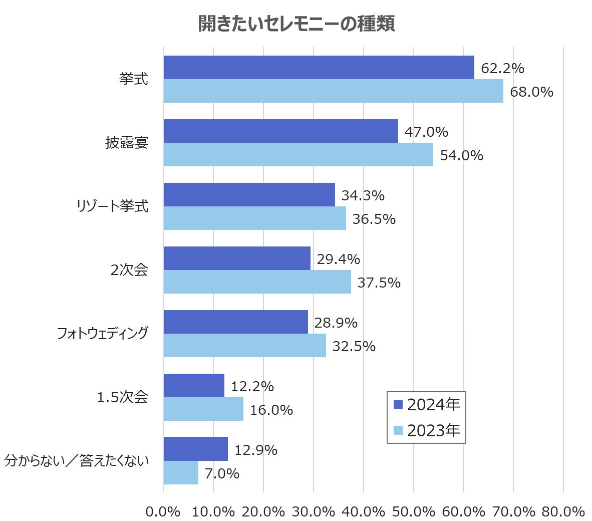 その結果、定番の「挙式」(62.2%)、「披露宴」(47.0%)が昨年同様トップ2となり、「リゾート挙式」(34.3%)が3位となりました。昨年調査と比較すると、「開きたい」と回答した人が減っていることもあり、どのタイプも減少傾向となりました。