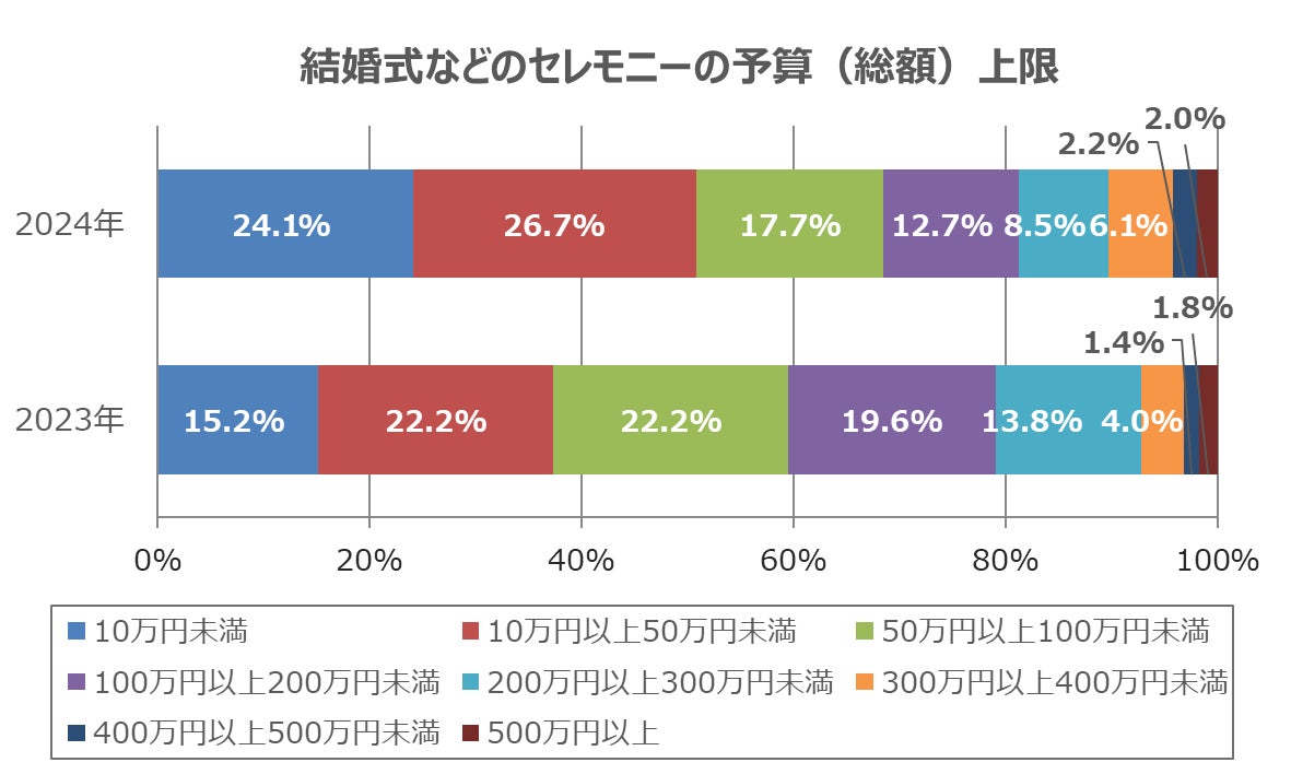 結婚式などのセレモニーの開催費用、100万円以内を希望する人は、昨年より9.0ポイント増加