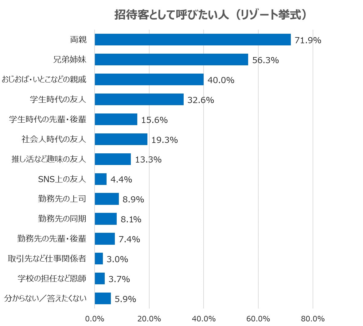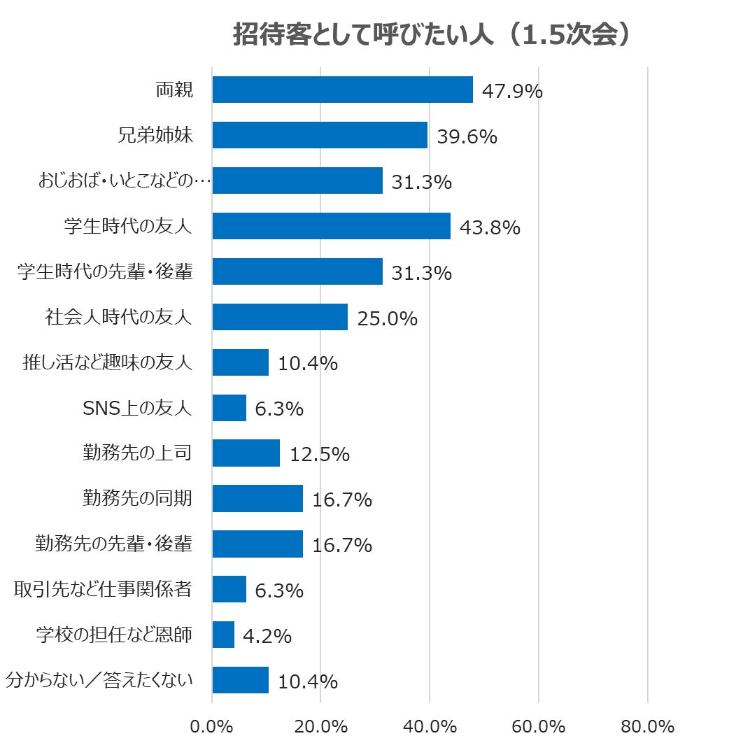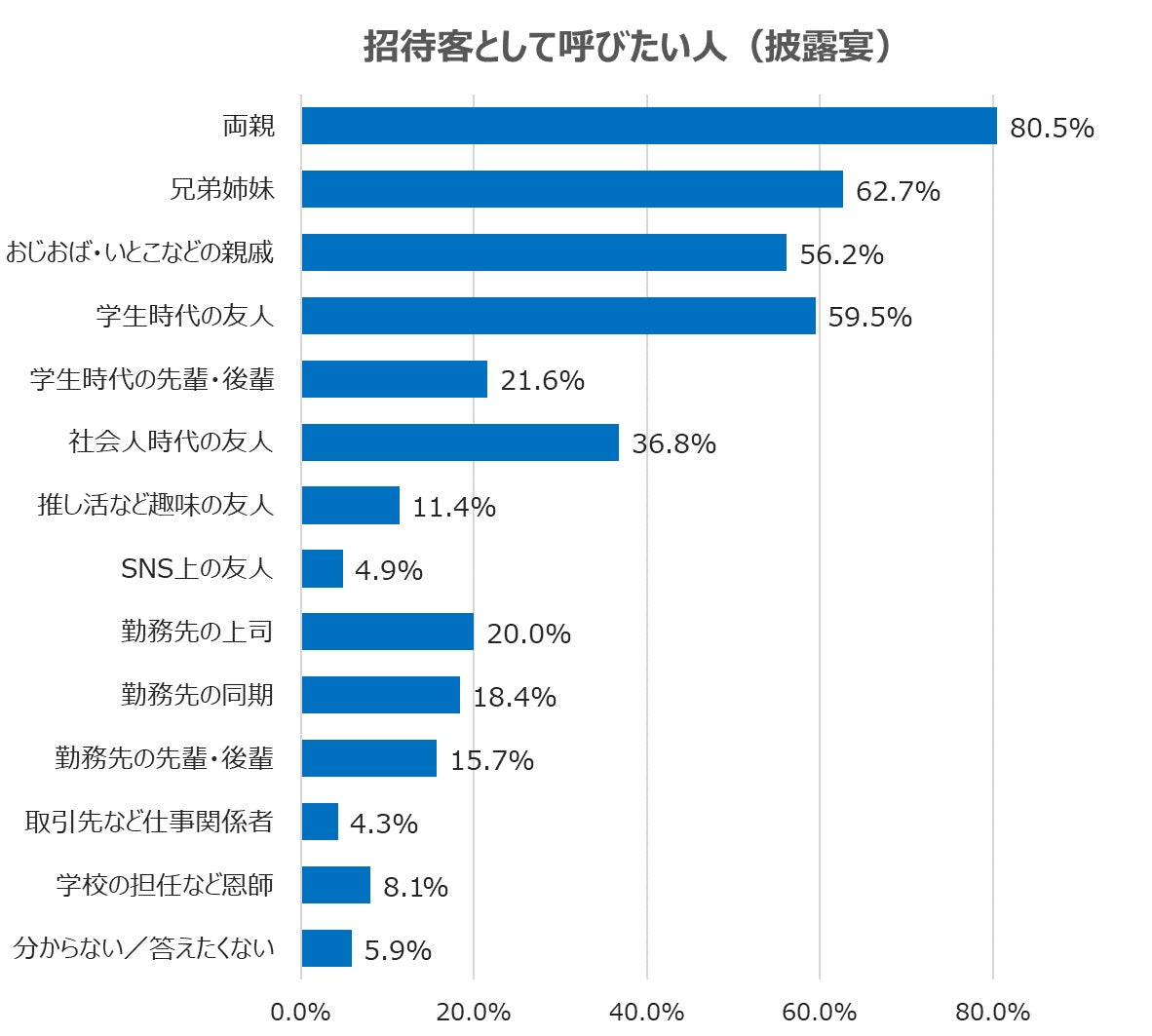 招待客として呼びたい人ごとに平均値を出したところ、トップ3は「両親」(64.5%)、「兄弟姉妹」(49.2%)、「学生時代の友人」(43.2%)でした。