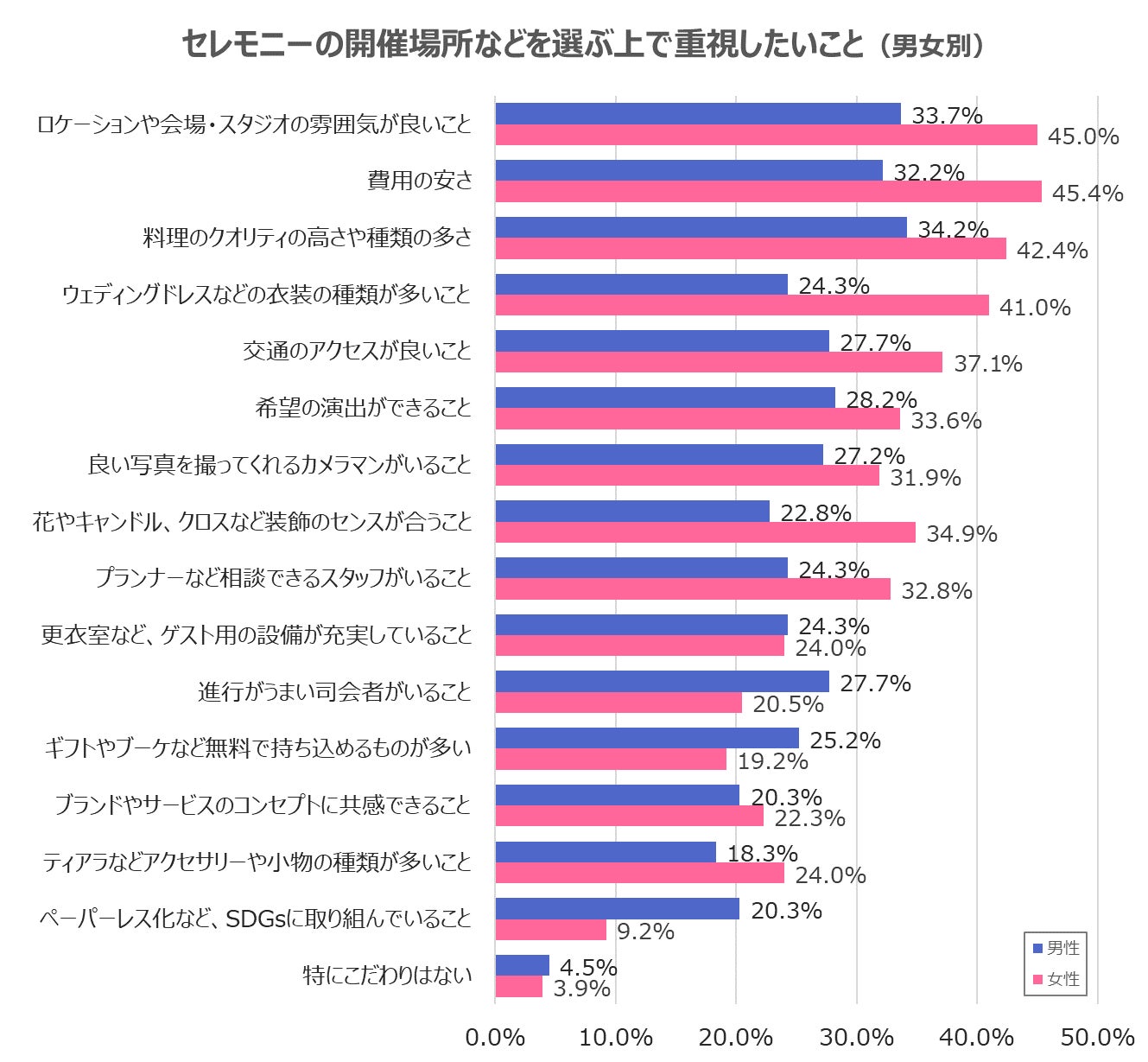 男女別では、ほとんどの項目で女性の方が割合は高く、特に「ウェディングドレスなどの衣装の種類が多いこと」(男性24.3%、女性41.0%)については16.7ポイント高い結果となりました。また、女性は「費用の安さ」(45.4%)を重視する人が最も多く、男性(32.2%)より13.2ポイント高くなっています。