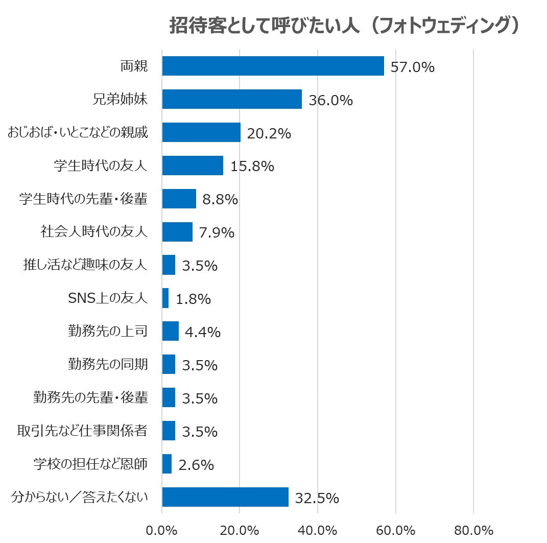 二次会、1.5次会については「学生時代の友人」が多く、二次会は58.6%で両親より多くなっています。フォトウェディングでは、「両親」(57.0%)や「兄弟姉妹」(36.0%)、「おじおば・いとこなどの親戚」(20.2%)といった身内が招待客のメインとして考えられているようで、他のセレモニーに比べて友人や会社関係者を呼びたいとした人は少ない結果となりました。