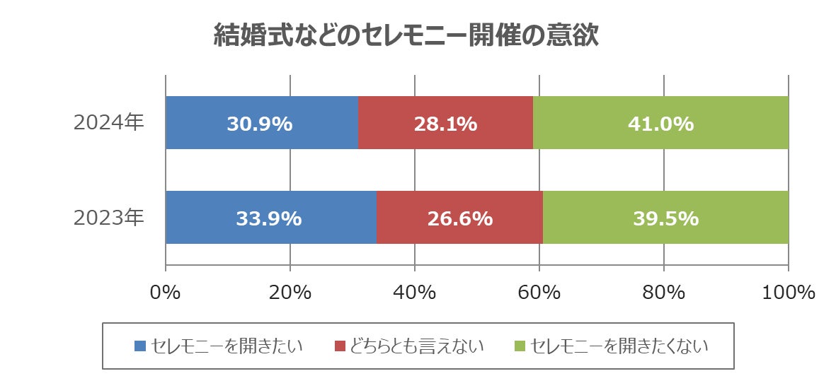 セレモニーについて「考えたことがない」(n=767)、「そもそも結婚したいという意欲がない」(n=1,325)、「分からない/答えたくない」(n=585)と回答した人を除いて集計したところ、「開きたい」人が30.9%、「どちらとも言えない」人が28.1%、「セレモニーを開きたくない」人が41.0%でした。