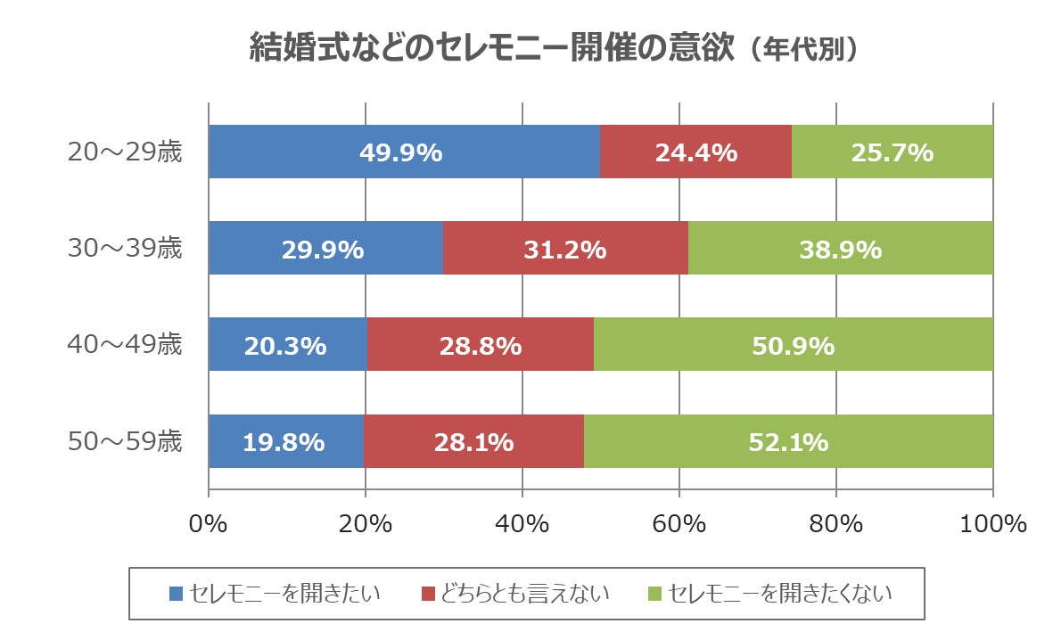 年代別に見ると、20代では49.9%が「セレモニーを開きたい」と回答。30代は29.9%、40代は20.3%、50代は19.8%と、年齢を重ねるにつれて「開きたい」と考える人の割合は下がる傾向にありました。
