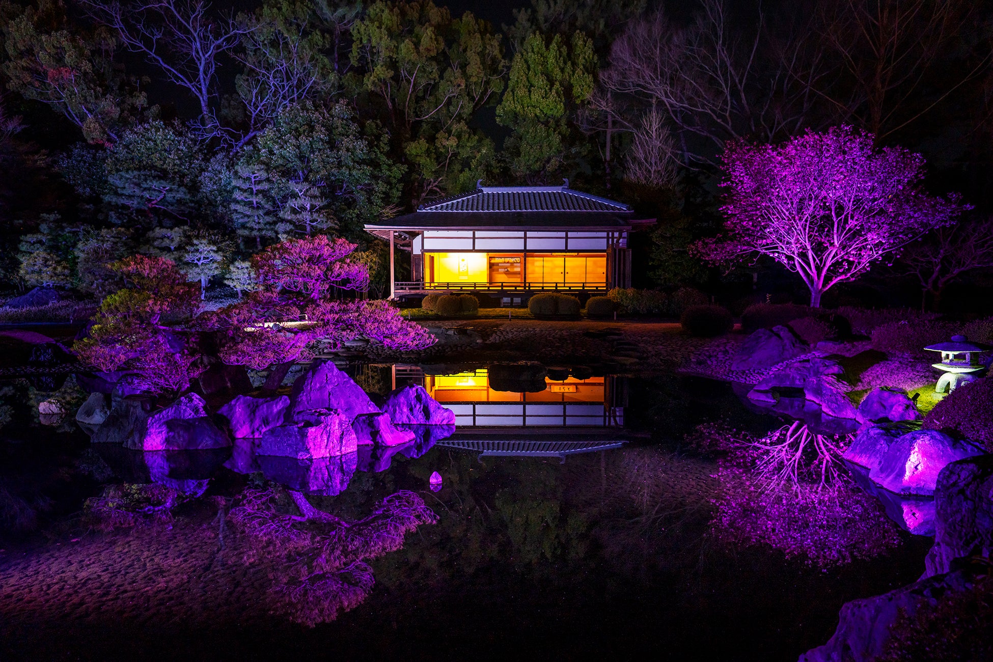 池に映り込んだ香雲亭を本物の桜とともに、音楽と光で演出。「あなたの桜」となる5品種の桜をイメージしたあかりで灯されます。