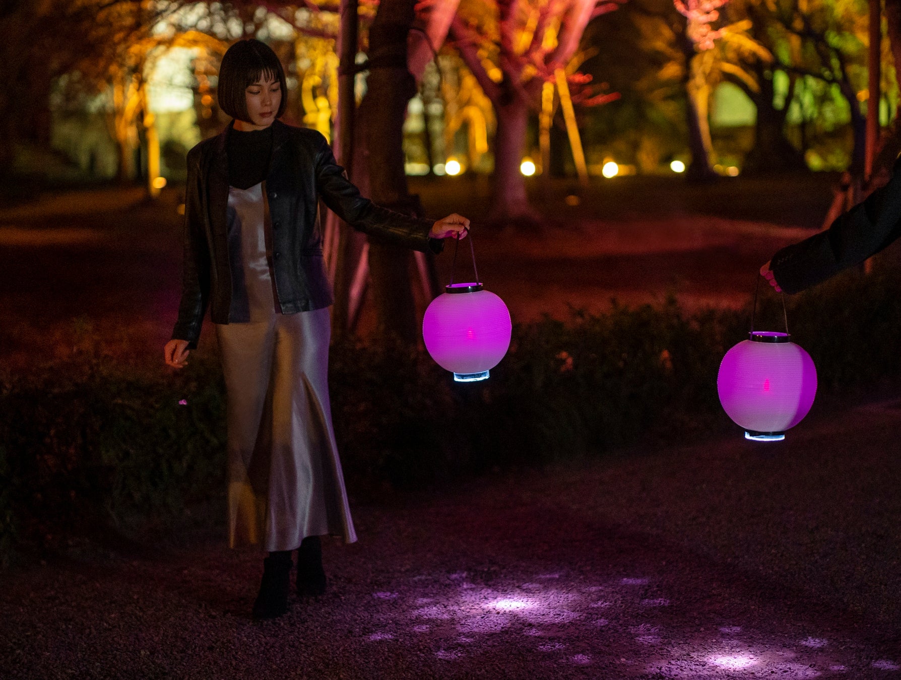 提灯が映し出す光の輪で、ソーシャルディスタンスをキープしながら自分自身も光の演出に参加。診断に基づく「あなたの桜」と同じ色と絵柄の提灯をお渡しします。