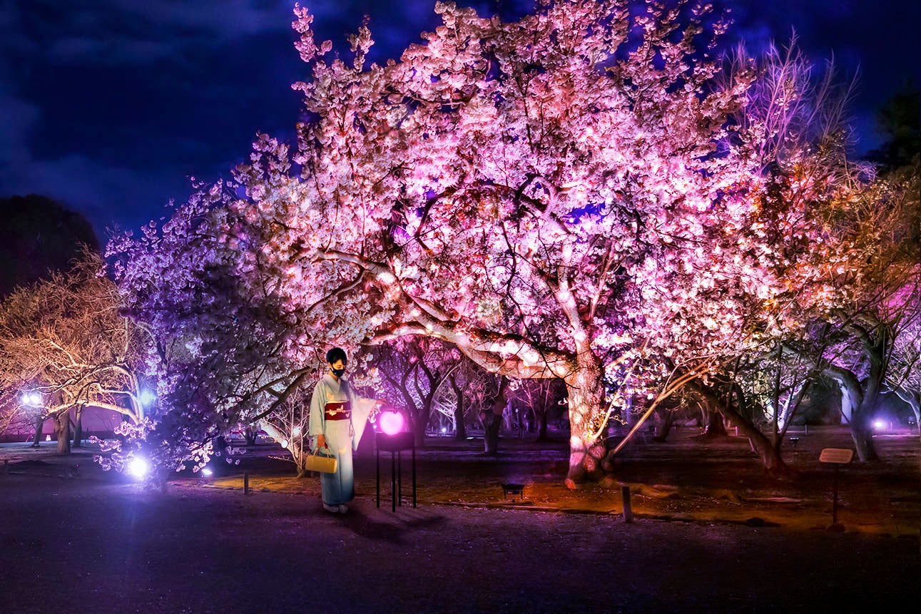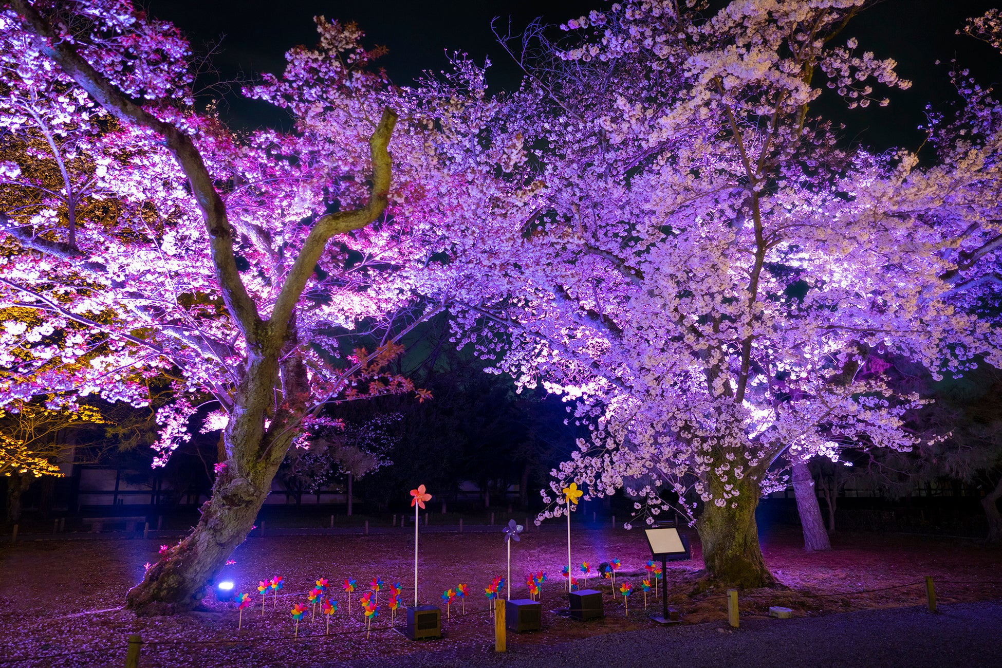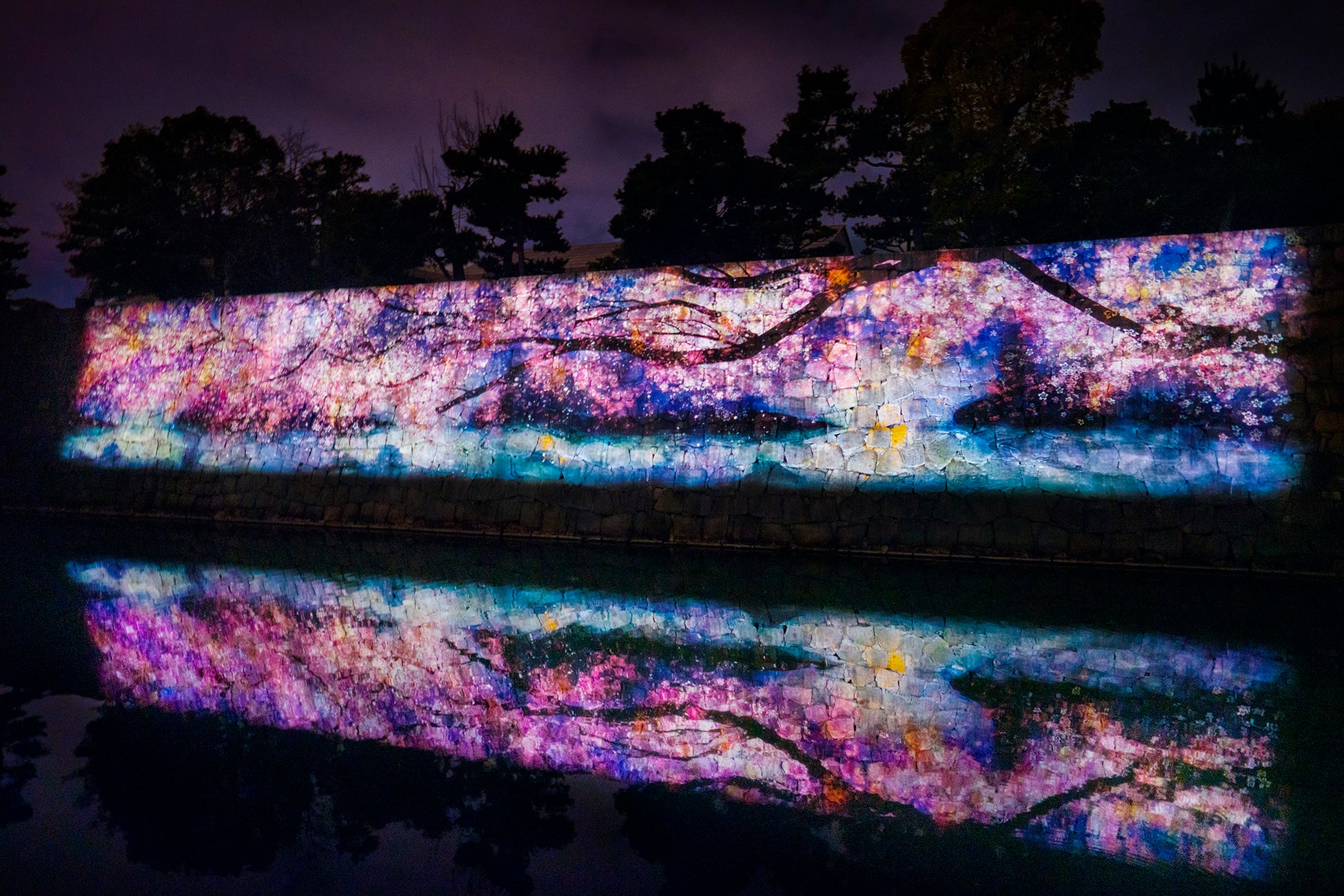 二条城の本物の桜をライトアップ。木々の美しさを際立たせるライトアップや音楽に包まれる幻想的な夜桜並木を演出します。