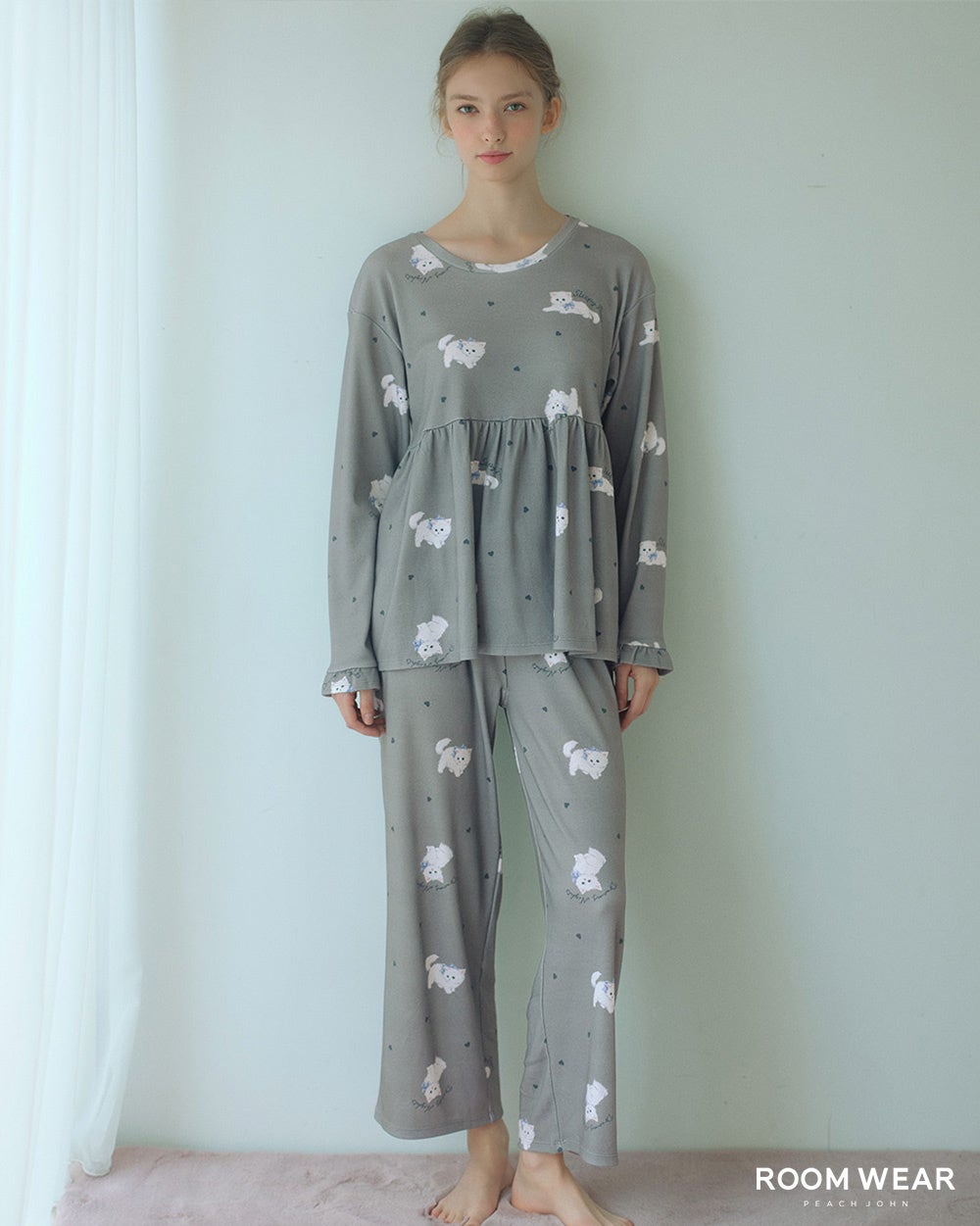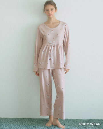 ゆったりしたシルエット、ふっくらボリュームのあるパフスリーブのトップ、ゆとりのあるストレートシルエットのボトムで、おうち時間をリラックスして過ごせる仕様。トップスの袖口付近に配したハート柄がポイントです。