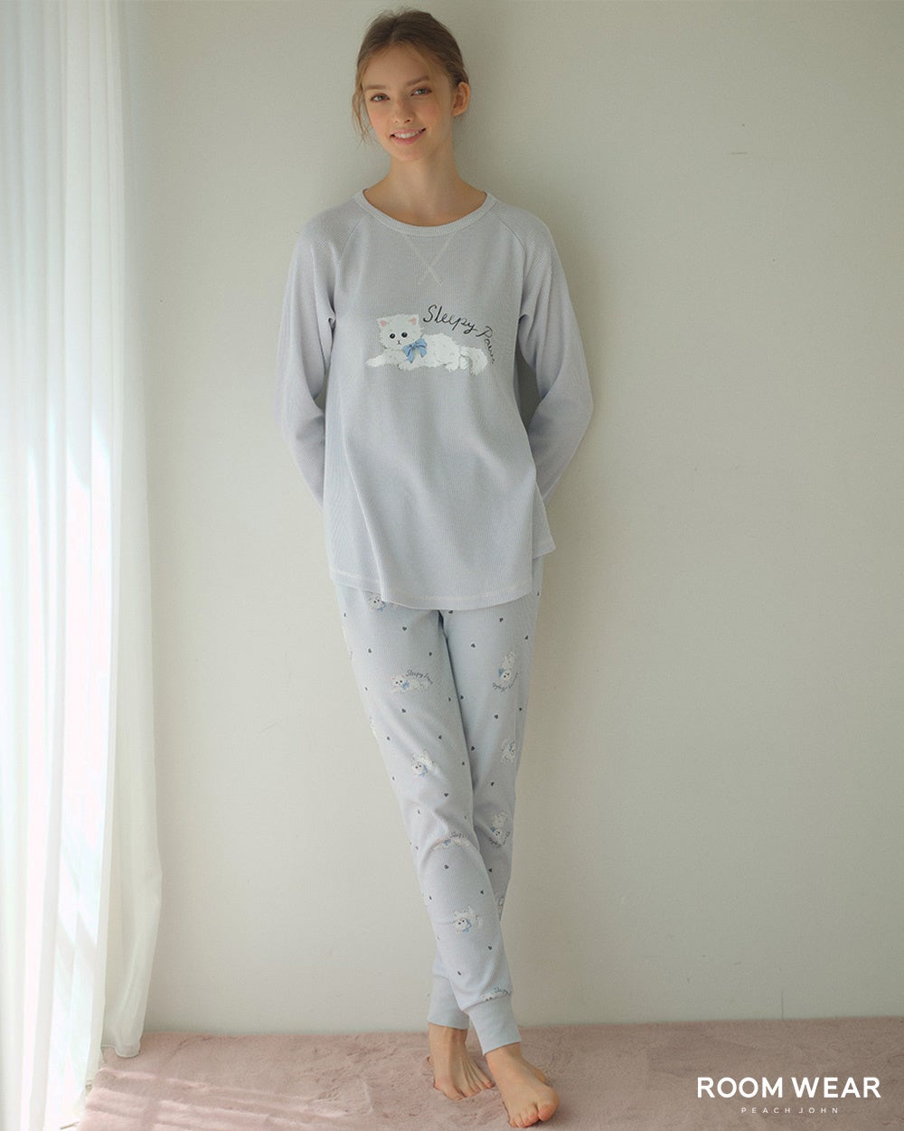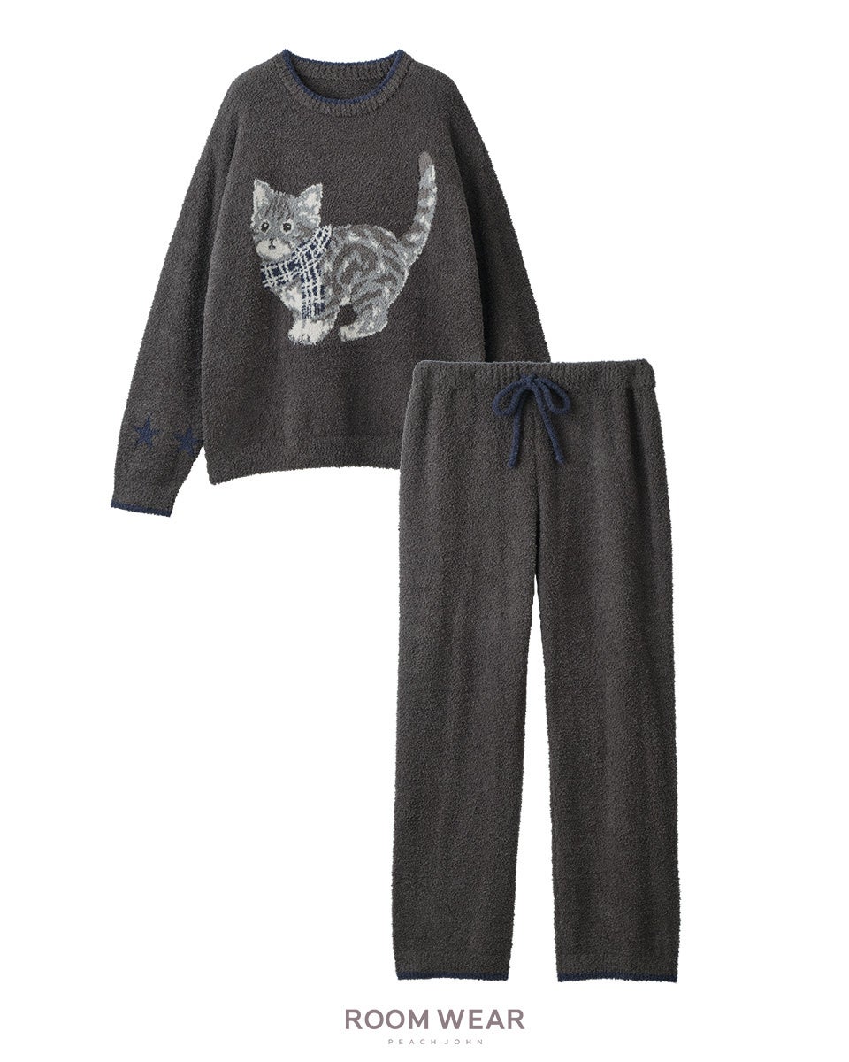 毎年大好評のPEACH JOHN ROOMの冬の定番、ホイップクリームのように柔らかな肌ざわりとあたたかさのモールニット、「ホイップリー」素材のパジャマ。リボンを結んだ、キュートな子猫のジャカード柄入りです。