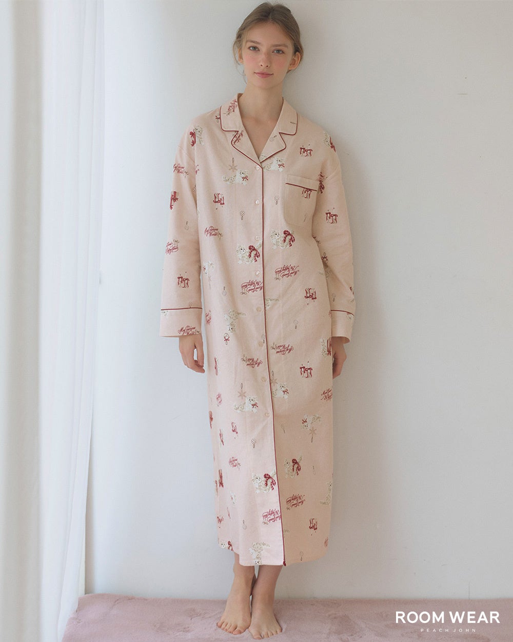 ボディを締め付けない、ラクな着心地のワンピースタイプもラインナップ。前を開けてローブとして活用することも可能です。