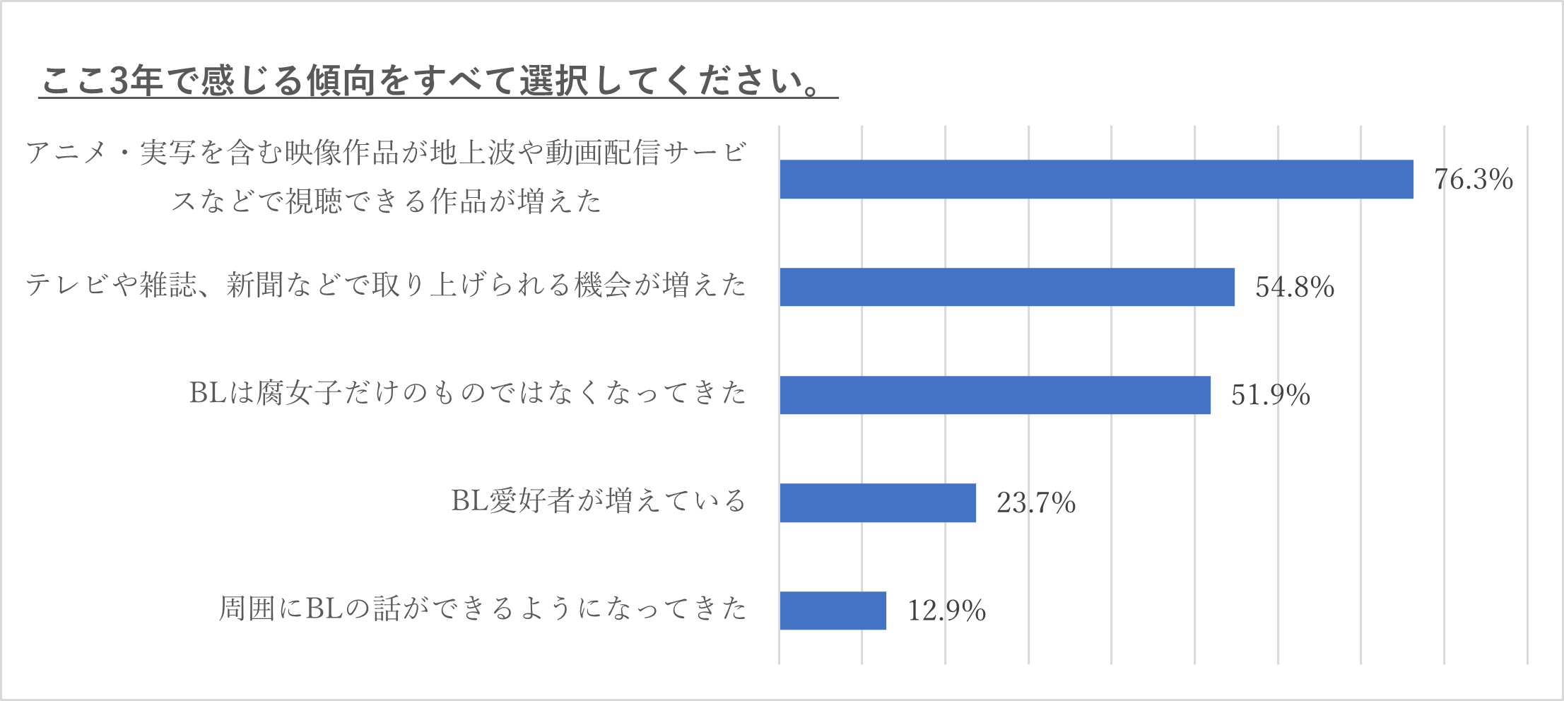 一方で「周囲にBLの話ができるようになってきた」は12.9%と、まだBLファンを公言することをためらう人も多いようです。その結果、「BL愛好者が増えている」と回答した人は23.7%に留まり、ファンが増えているという実感はあまり湧いていないことが分かりました。