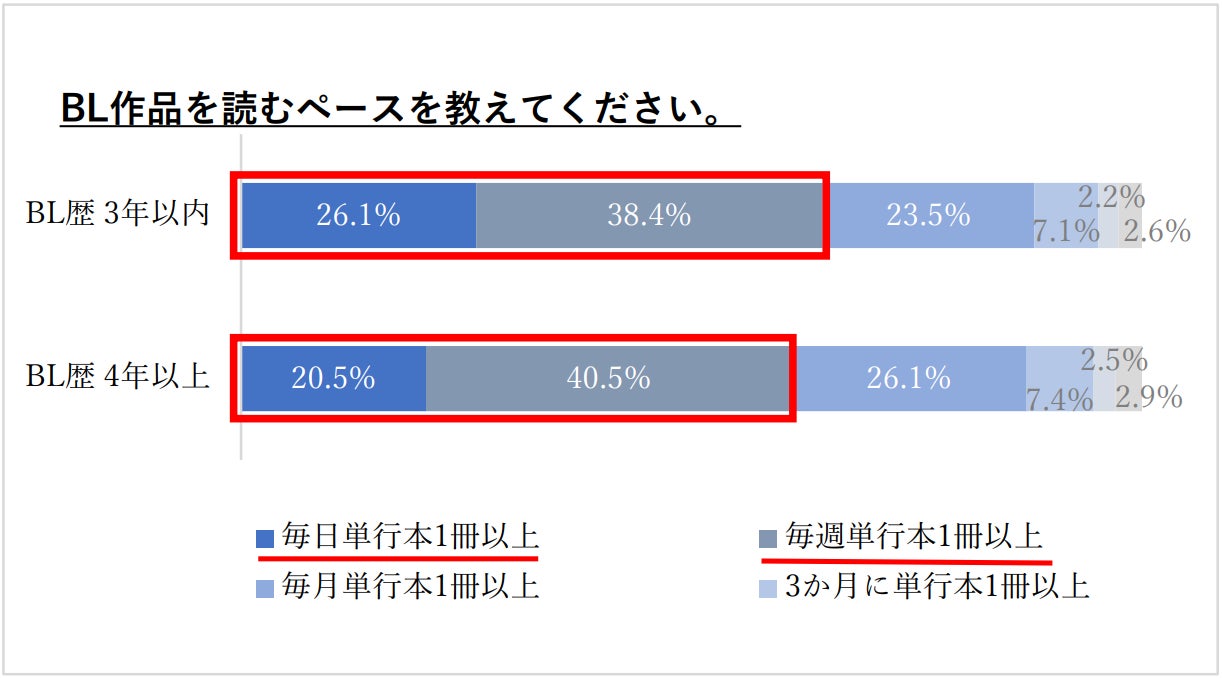 また、「BLを読む頻度」については「毎週単行本1冊以上」読むという回答が最も多く、直近3年以内にBLを読み始めた人で38.4%、4年以上で40.5%でした。3年以内の人は次いで「毎日単行本1冊以上」が26.1%、4年以上の人は「毎月単行本1冊以上」が26.1%。全体でみると、BL歴にかかわらず「毎週単行本1冊以上」読んでいる人が60%を超えています。また「月に1冊以上読む」は全体のおよそ90%と、BL作品は定期的に読みたくなる中毒性の高いエンタメだといえそうです。