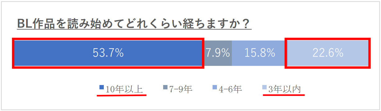 ①BLを読み始めて10年以上の読者が53.7%と最多