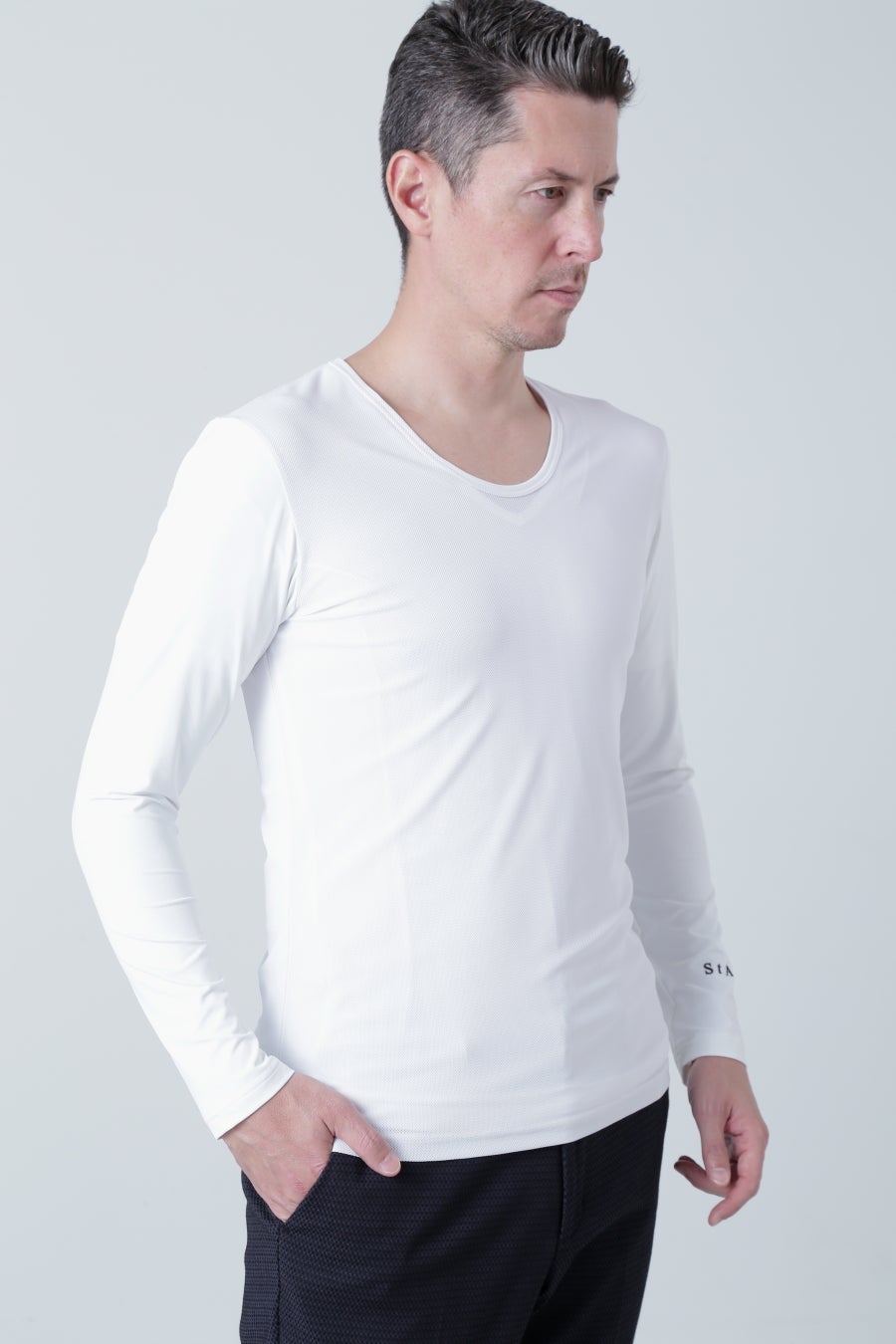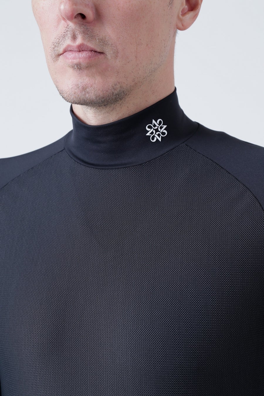 大きな動作をサポートするラグランスリーブで切り替えした袖にはUVカット・薄さ・軽さ・ストレッチ性・吸水速乾性を備え、夏のラウンドも快適に過ごせるスポーツアンダー用ニット素材「サンプロフィット」を採用。