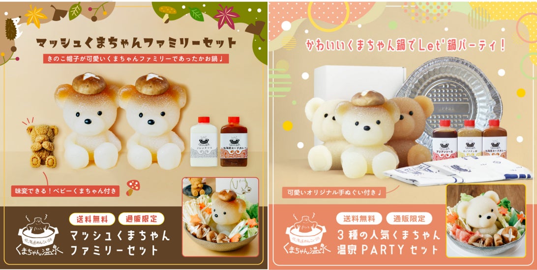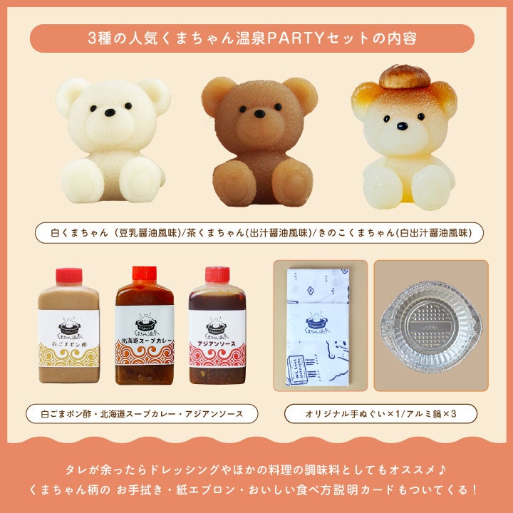 この度「北海道めんこい鍋 くまちゃん温泉」のオンラインショップから、昨年販売し可愛い見た目が話題となった「マッシュくまちゃん」がファミリーになって新登場。味噌味のベビーくまちゃんがついており、白出汁醬油風味の親くまちゃんのお出汁をご堪能いただいたあとは味噌味のベビーくまちゃん投入で味の変化も楽しめます。また、人気の出汁、タレが楽しめる「3種の人気くまちゃん温泉PARTYセット」も新登場。