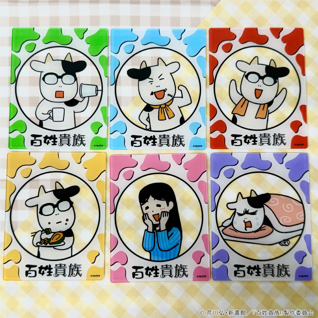 荒川先生と親父殿、荒川先生の担当編集・イシイさんの1シーンを切り取った牛柄アクリルカードは、全種コンプリートしたくなります♪