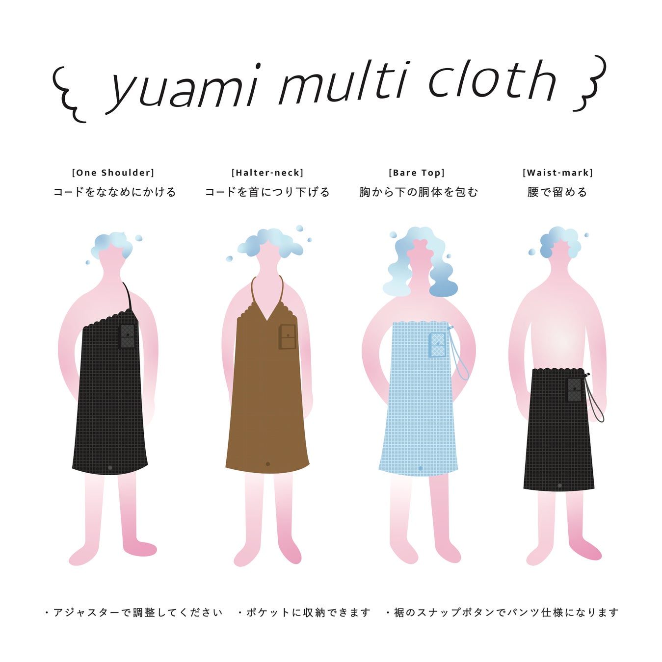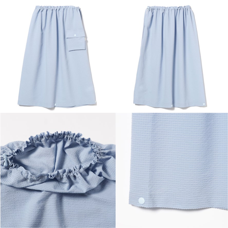 絞り部分に通されたコードを、斜めに片側の肩にかける(ワンショルダー)/首にかける(ホルターネック)/胸の上で留める(チューブトップ)/腰で留める(腰巻き)など、カバーしたい場所に応じて工夫できるよう、4通りの着用方法を想定したデザインです。裾のスナップボタンを留めることでズボン型になり、入浴中に裾が浮き上がりません。