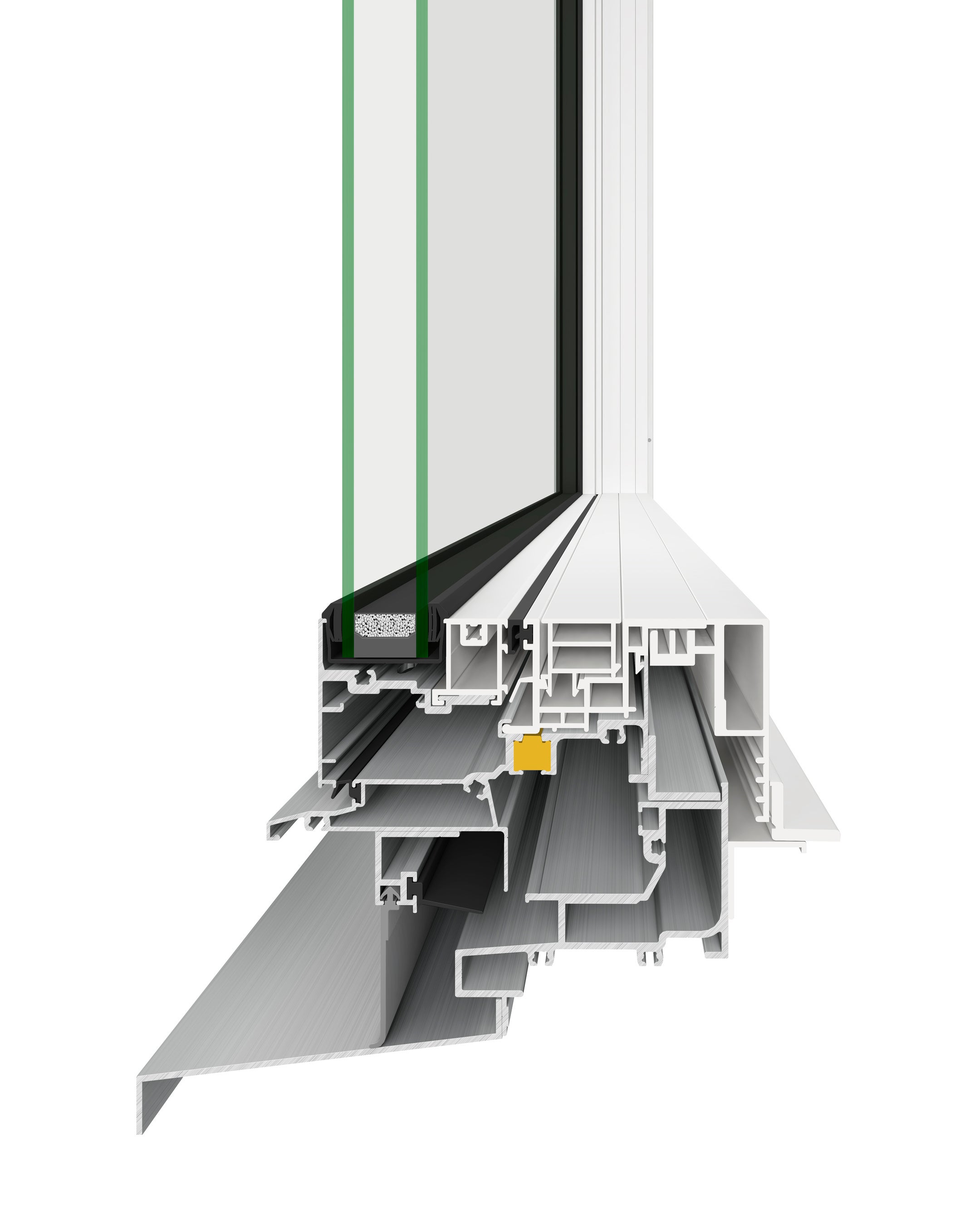 窓の室外を強度と耐久性に優れたアルミ、室内を断熱性に優れた樹脂を使ったハイブリッド構造。熱貫流率Uw1.9[W/(㎡・K)]以下の高い断熱性能に刷新。
