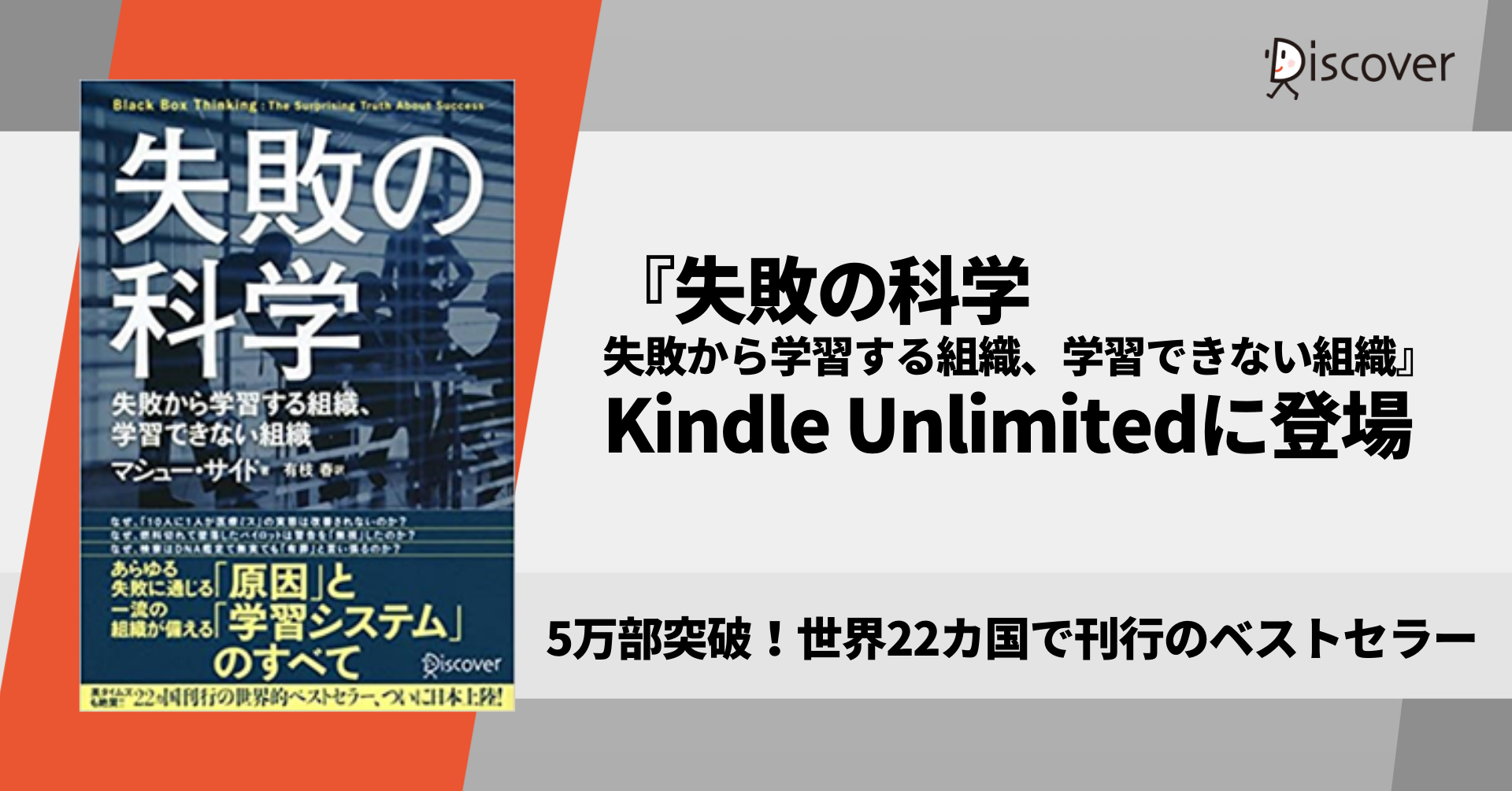 株式会社ディスカヴァー・トゥエンティワン(本社:東京都千代田区、取締役社長:谷口奈緒美)は、2021年12月27日より、『失敗の科学 失敗から学習する組織、学習できない組織』(マシュー・サイド 著、有枝春 訳)をKindle Unlimitedにて配信開始しました。