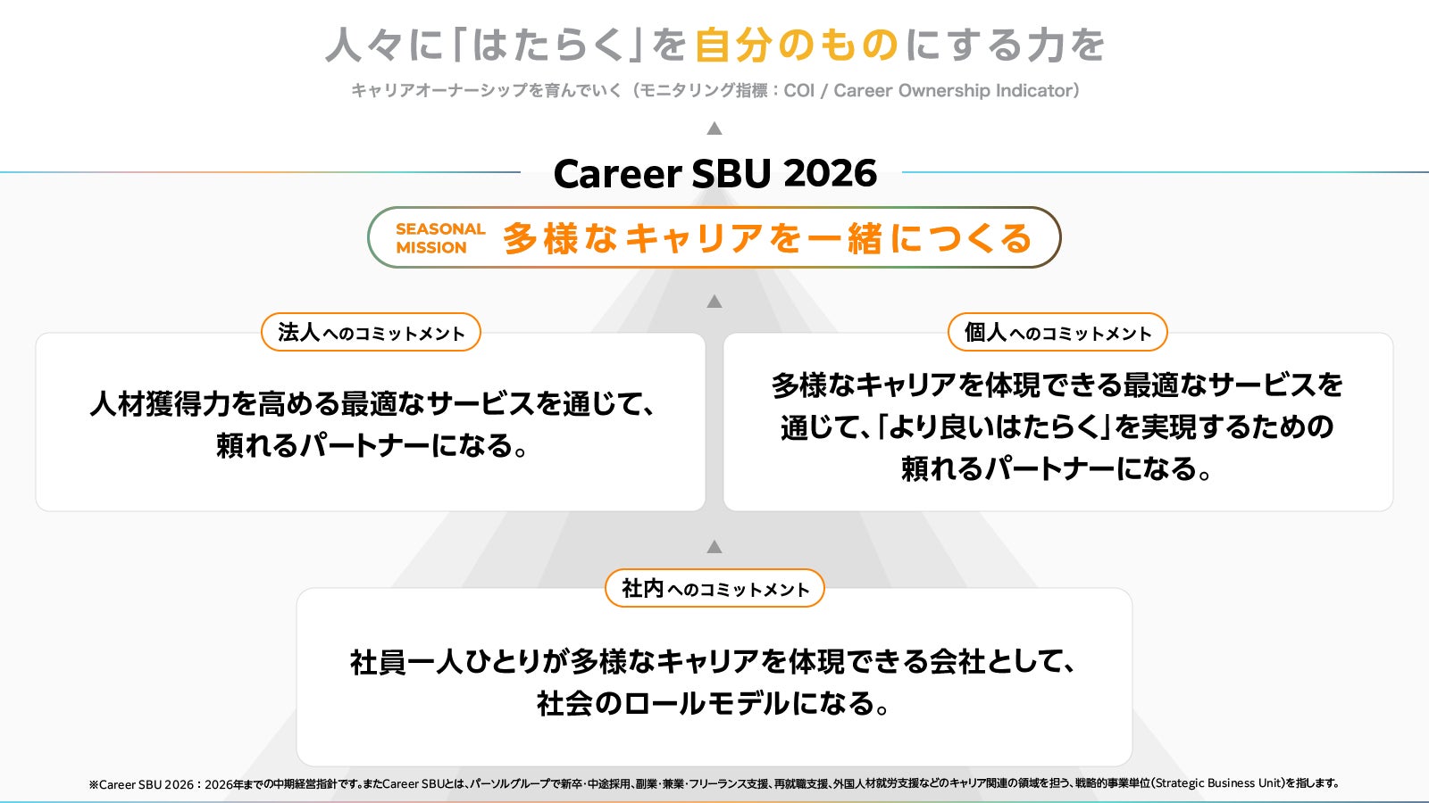 「Career SBU 2026」では、SEASONAL MISSION「多様なキャリアを一緒につくる」を掲げ、「個人」「法人」のお客さま、そして「社内」に向けた3つのコミットメントを定めています。