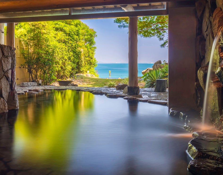 淡路島から車で10分、瀬戸内海国立公園内。海に昇る朝日やムーンロードを客室や天然温泉から一望するオーシャンフロントホテル。