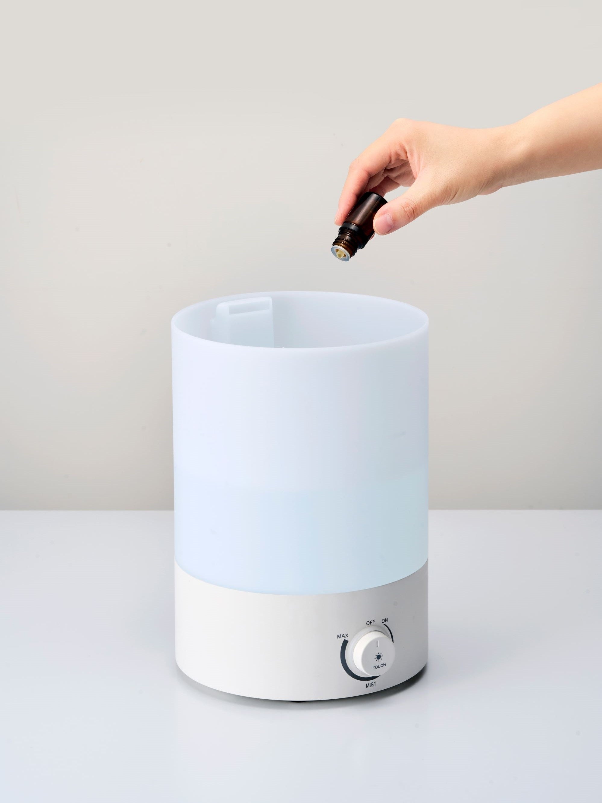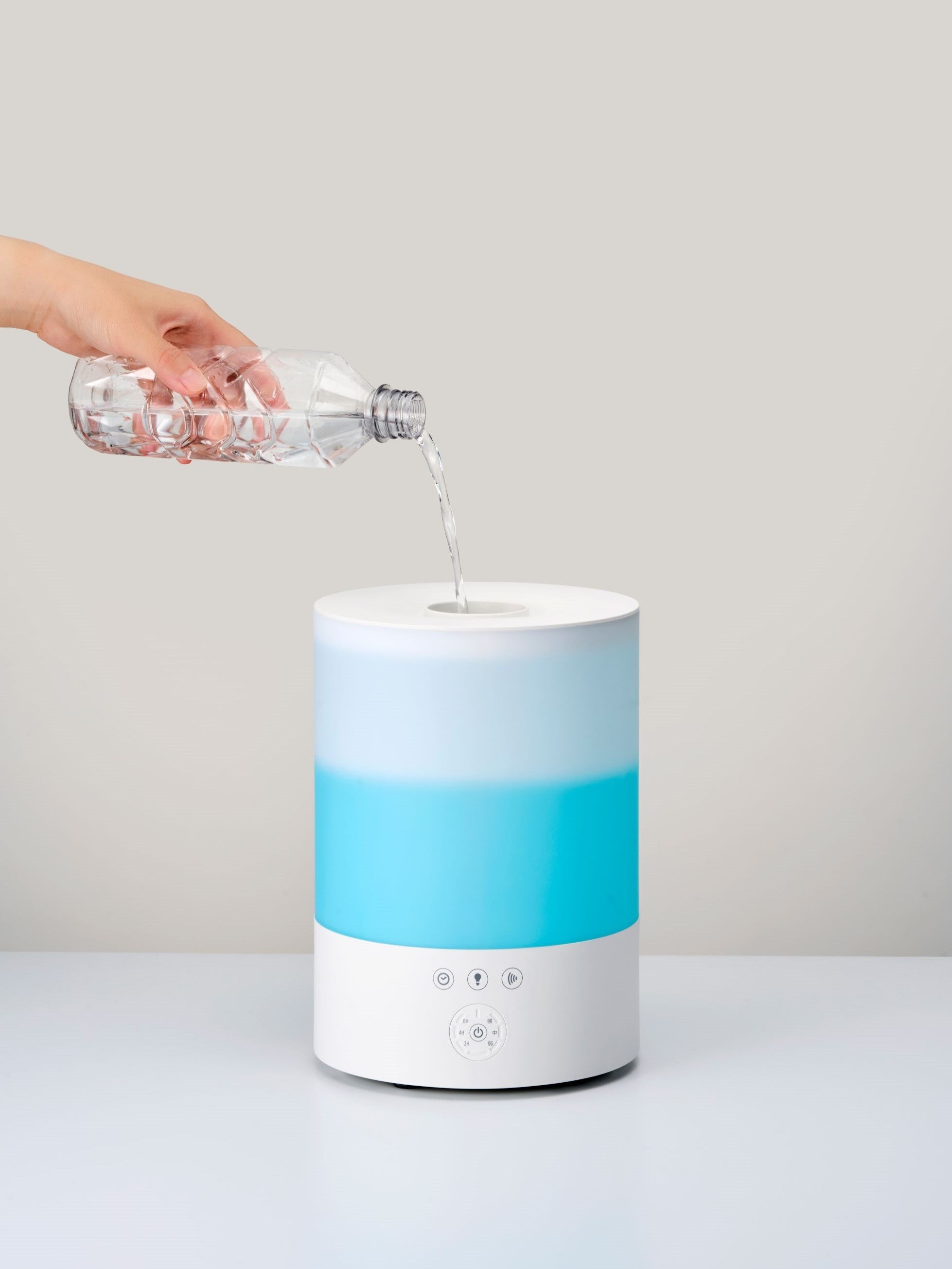 水タンクに直接アロマオイルを入れられる素材を採用しています。これにより、アロマ専用トレーやアロマパッドを用意することなく、お気に入りの香りを加湿器のミストとともに楽しむことができ、乾燥対策をしながらリラックスタイムを過ごすことができます。