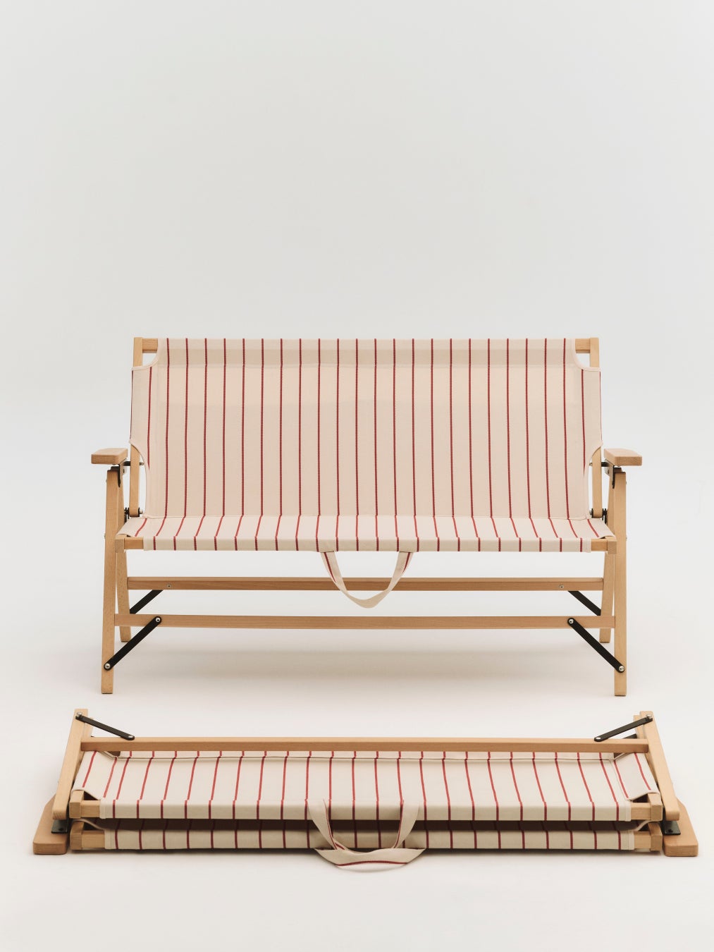 軽量なビーチ材のフレームと、ストライプ柄の再生ポリエステル素材のシートを組み合わせたこのソファは、座面と背もたれの両方にハンドルが付いており、持ち運びも簡単です。収納や移動に便利な同素材のバッグが付属します。