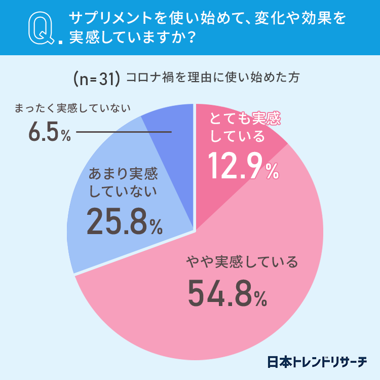 「コロナ禍を理由に使い始めた」方に、サプリメントを使い始めて変化や効果を実感しているかについて聞きました。