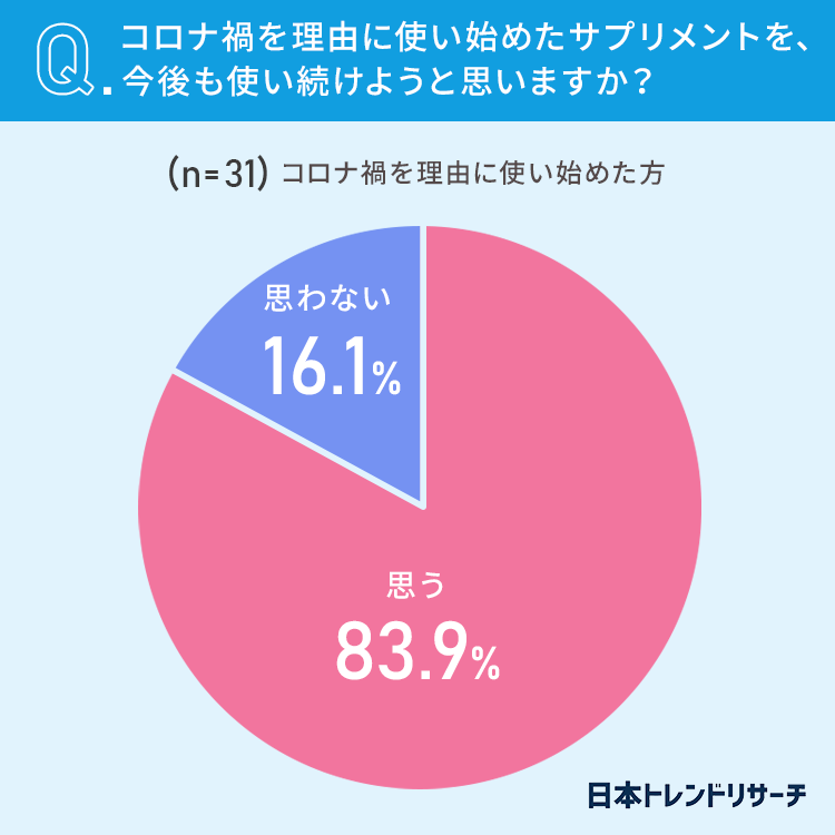 83.9%の方が、コロナ禍を理由に使い始めたサプリメントを今後も使い続けようと「思う」と回答しました。