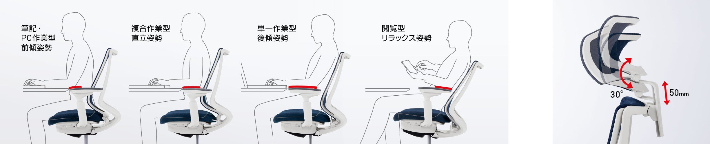 可動肘は肘当て部分が前後に大きくスライドすることで、前傾、アップライト、後傾など、それぞれの姿勢に対して身体に沿った位置に移動できます。さらに、体格や作業姿勢に合わせて、ヘッドレストの高さと角度を調節することができるため、肩や首への負荷も軽減します。