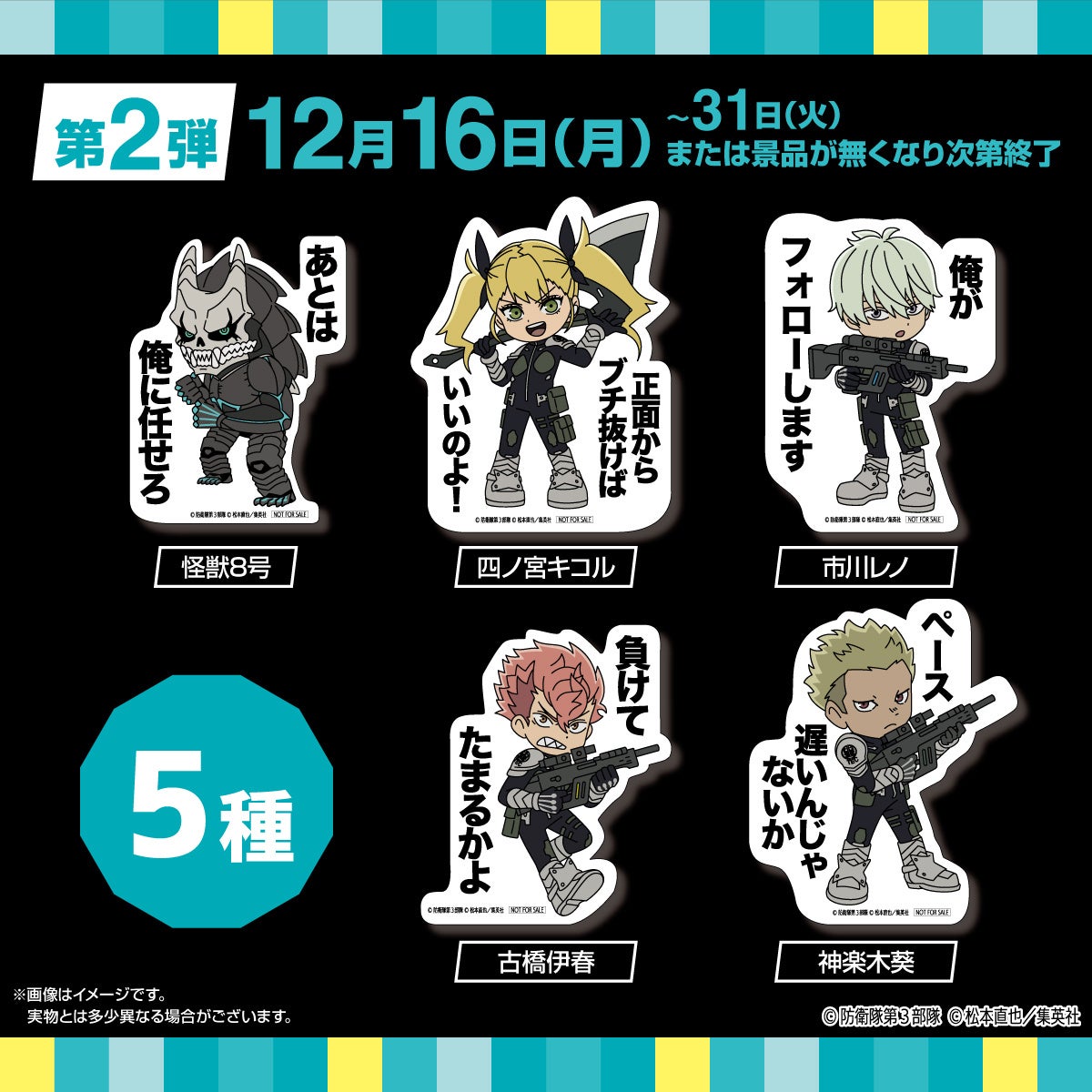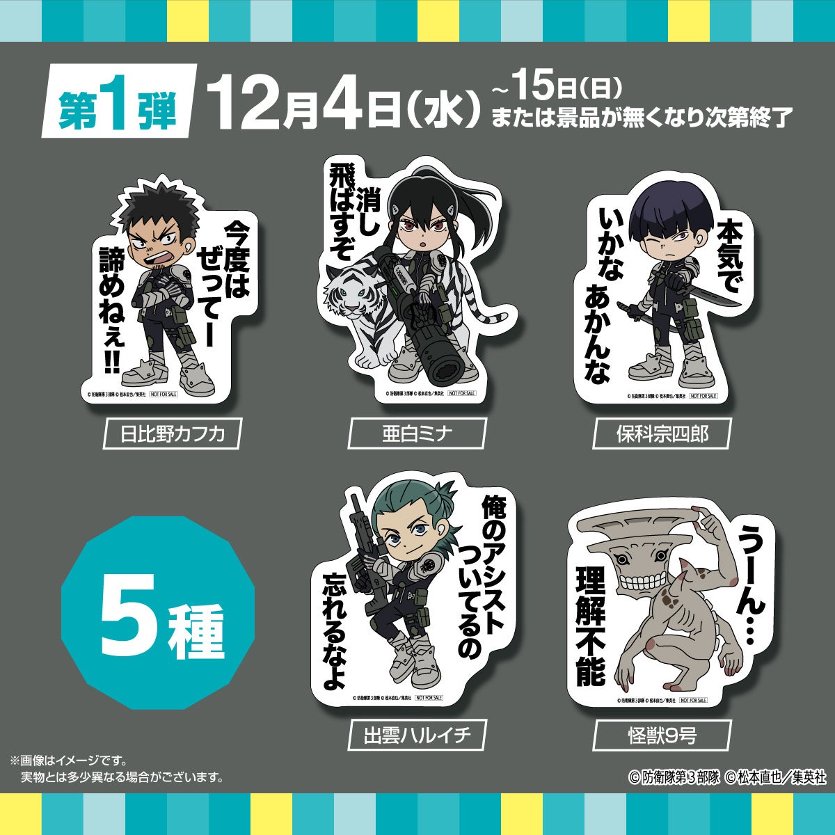 第一弾では、日比野カフカ、亜白ミナ、保科宗四郎、出雲ハルイチ、怪獣9号の5種類、第二弾では、怪獣8号、市川レノ、四ノ宮キコル、古橋伊春、神楽木葵の5種類の中からランダムでプレゼントいたします。中身が見えない袋に封入されているため、どのキャラクターがもらえるかは、開けてからのお楽しみです。
