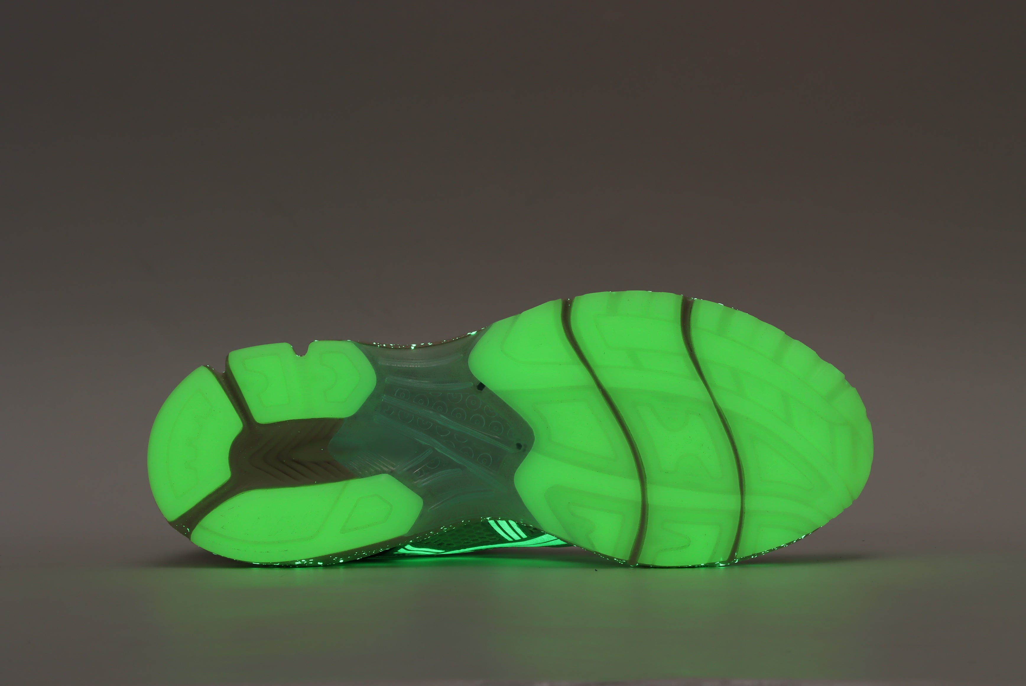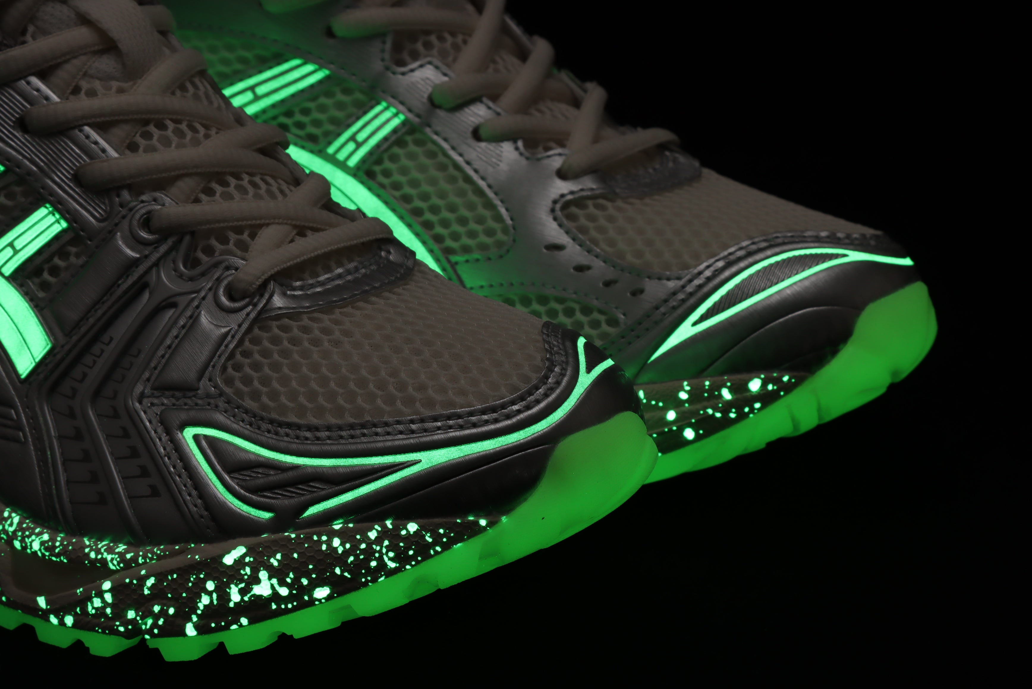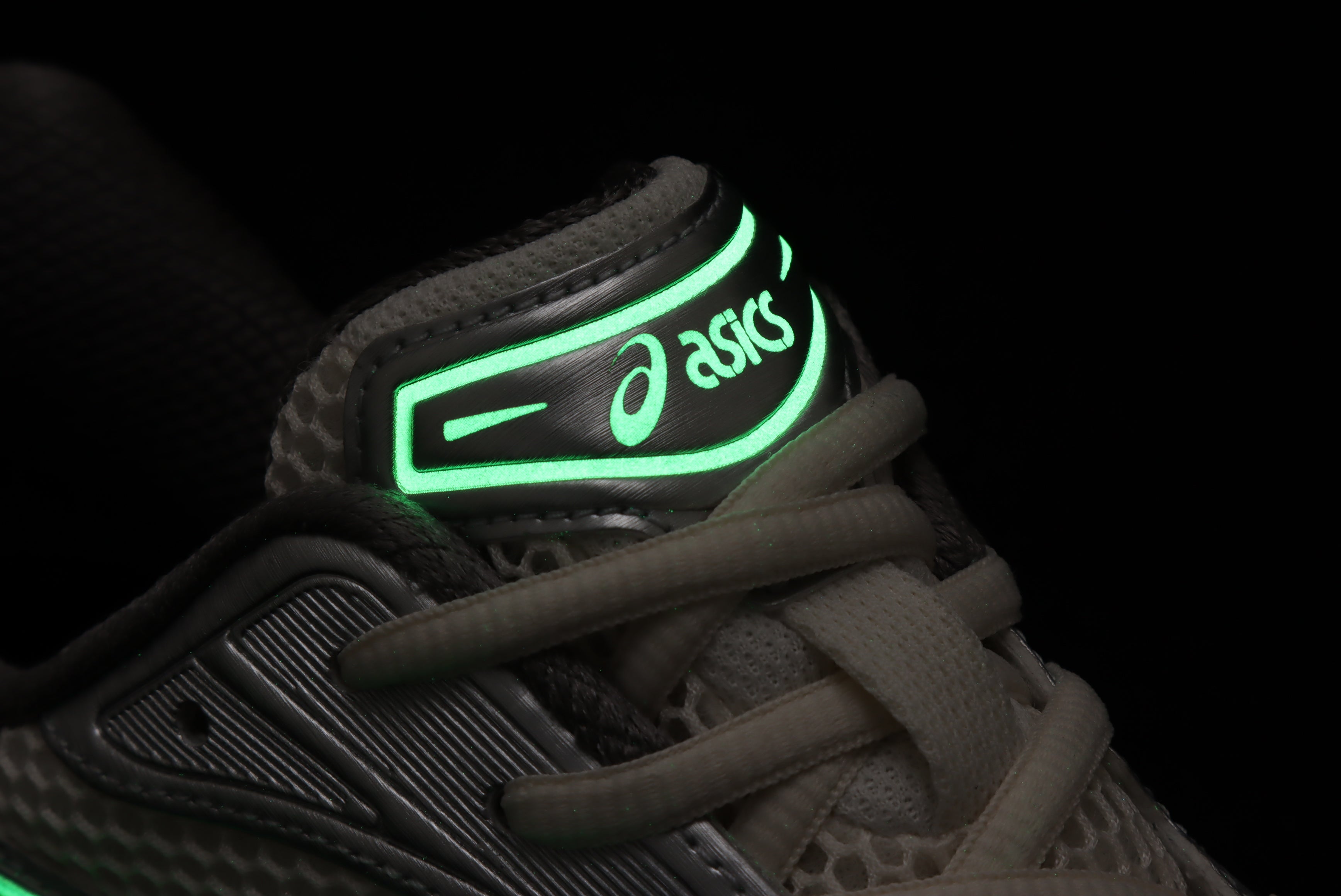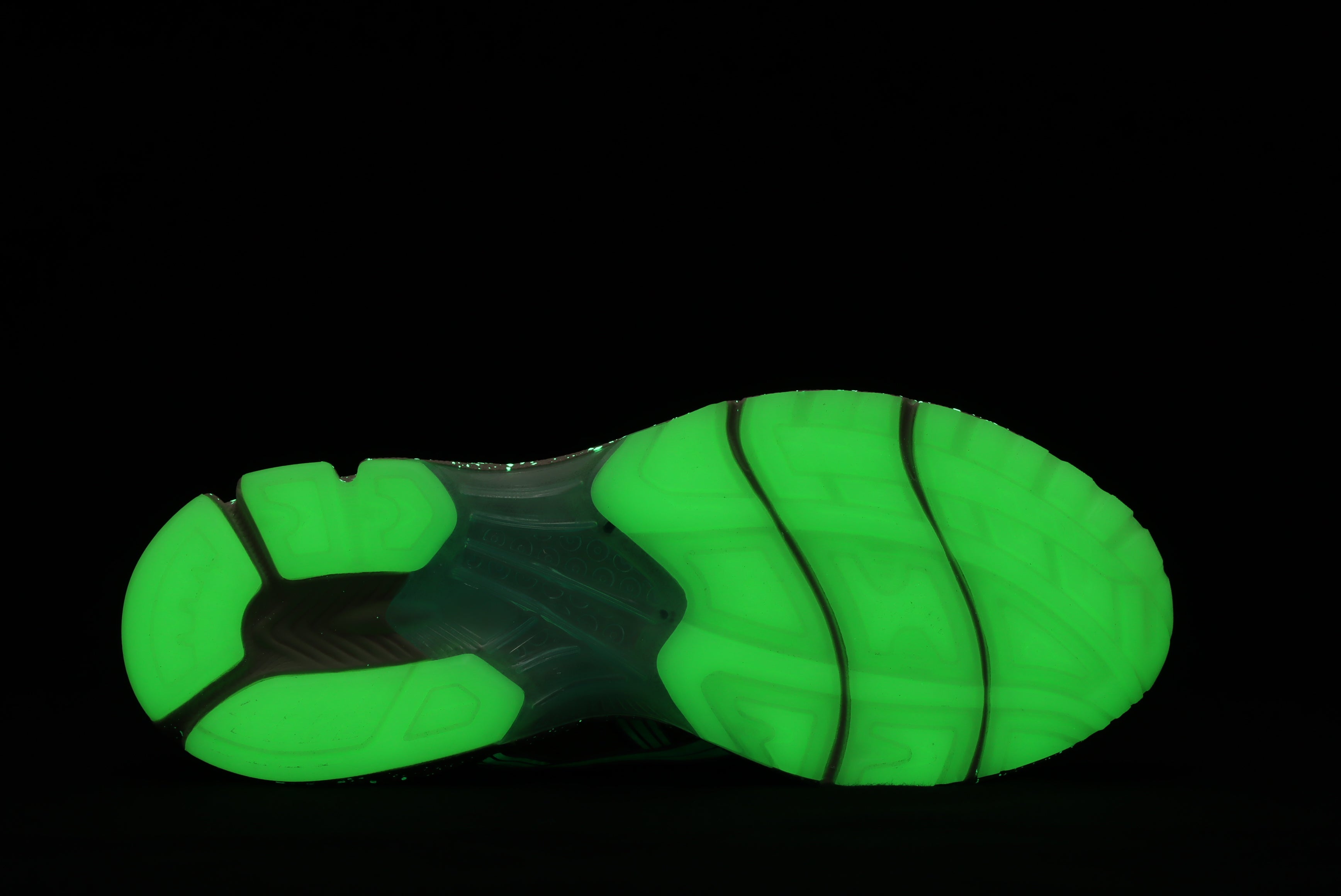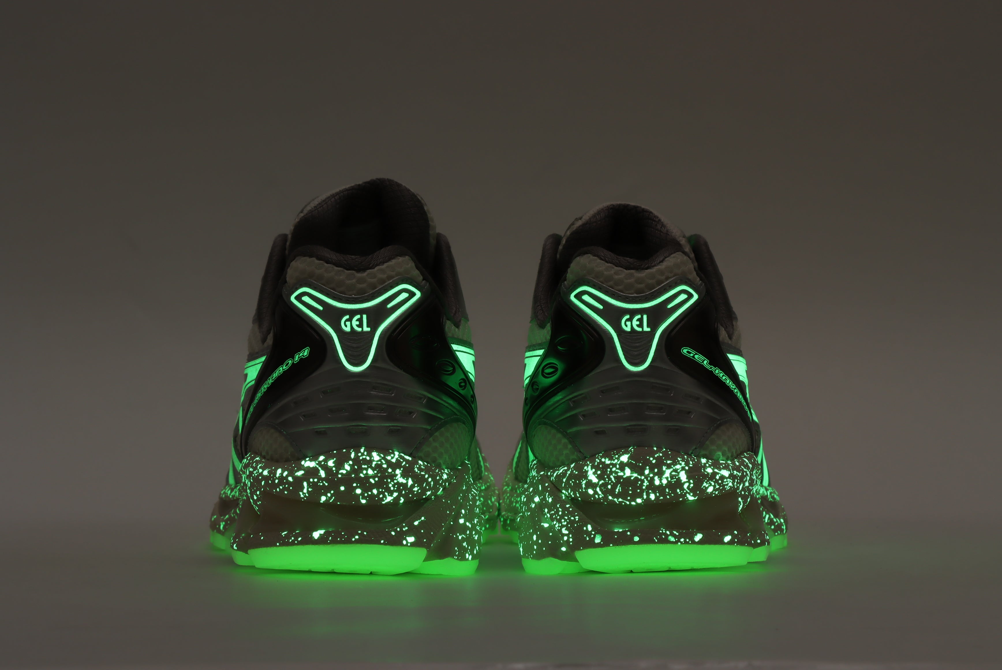 アシックスストライプやミッドソール、アウトソール、ディテールといった随所に蓄光を施し、閃光をイメージするヒール部のパーツには“夜光茸”が生育する土を連想させるブラウンカラーで仕上げました。さらに、インナーソールにも暗闇で光る“夜光茸”のグラフィックをギミックして細部にまで拘った仕様に。