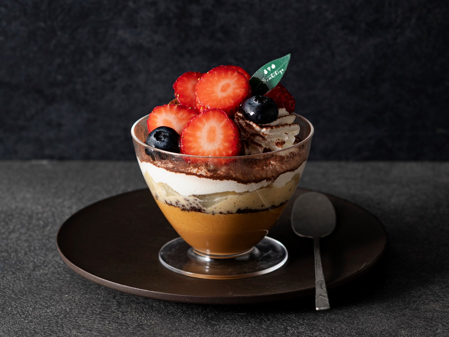 キャラメルソースに塩キャラメルムース、フルーツも満載のご褒美パフェ!食べ進めるごとに異なるおいしさに出会える、見た目も味もゴージャスな一品です。一番下から、ほろ苦キャラメルソース、ミルキーな塩キャラメルムース、洋梨入りカスタード、生クリームと味の変化が楽しめます。いちご・ブルーベリーを添えた、華やかなデザートです。