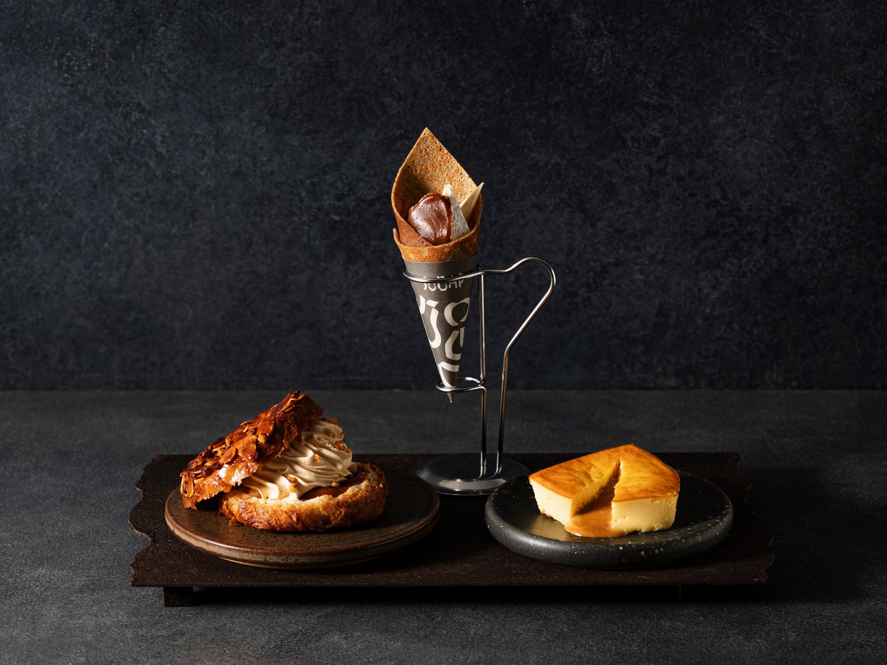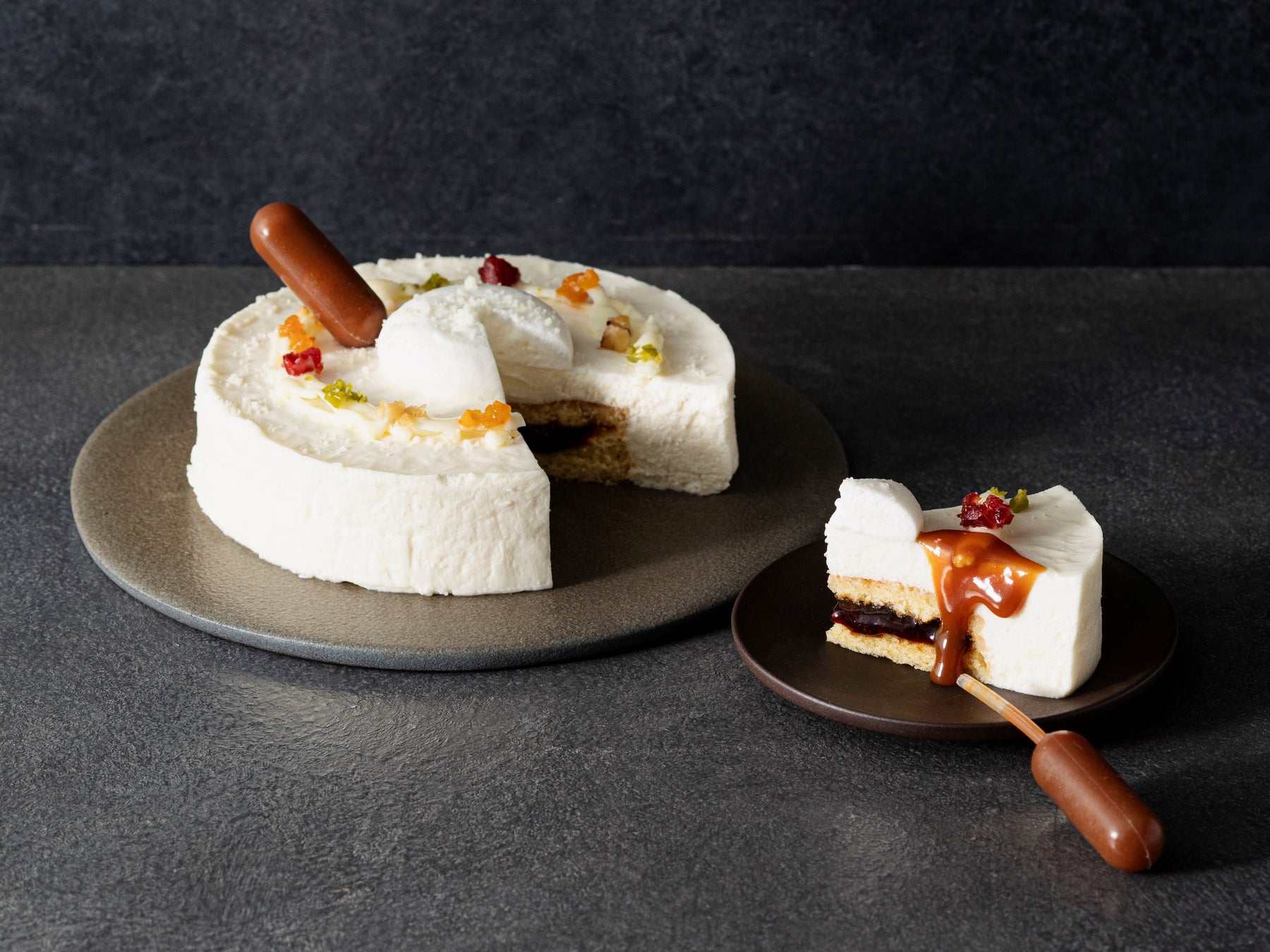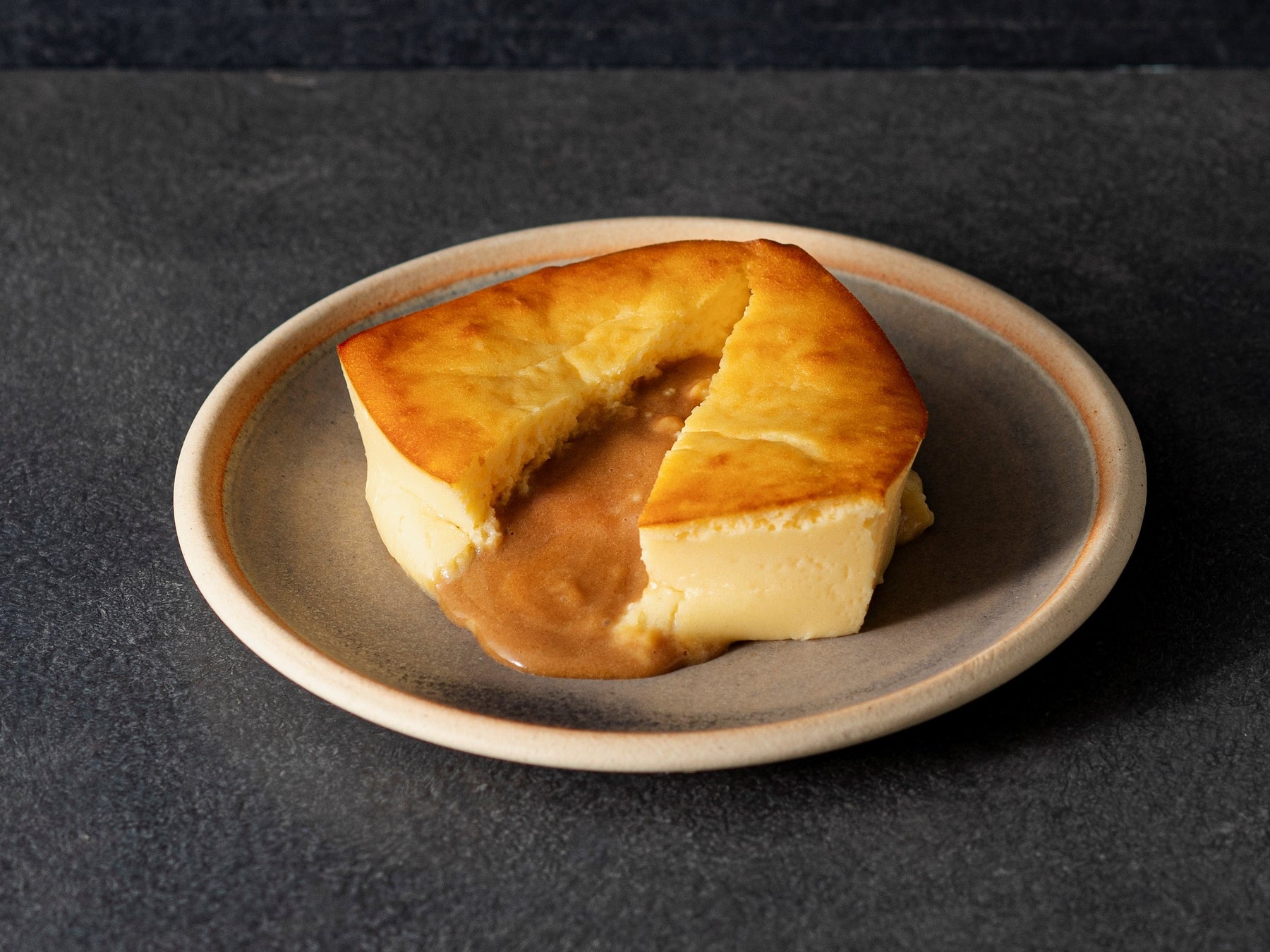 ほろ苦カラメルと甘いキャラメル、2種のソースが彩るレアチーズケーキ。深いコクとうま味が特徴のパルミジャーノ・レッジャーノを使ったレアチーズケーキの中には、しっとりスポンジとカラメルソースが隠れ、ワインなどお酒のお供にもぴったり。スポイト内の濃厚キャラメルソースをかけて味の変化も楽しめます。※イベント展開期間:1/14~1/26