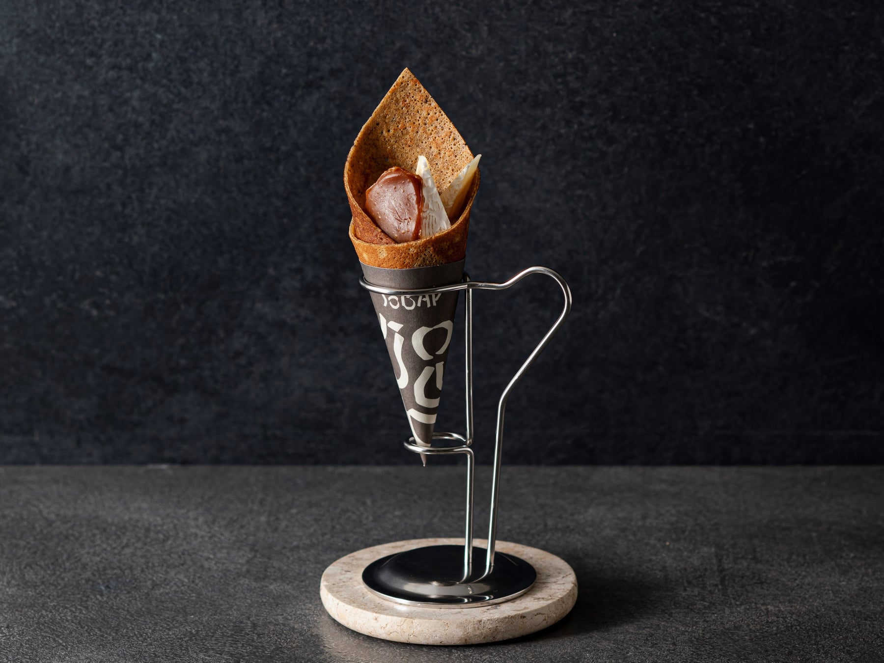 満足感たっぷりの甘塩っぱいバランスがたまらない、新感覚のそば粉ミニクレープ。ビターな塩キャラメル、芳醇なうま味のカマンベールチーズが、おいしいハーモニーを醸します。下には、生クリームにカスタードを合わせたディプロマットクリーム、ザクザクのグリッシーニも入っていて、異なる味と食感が生み出す深い味わいが楽しめます。