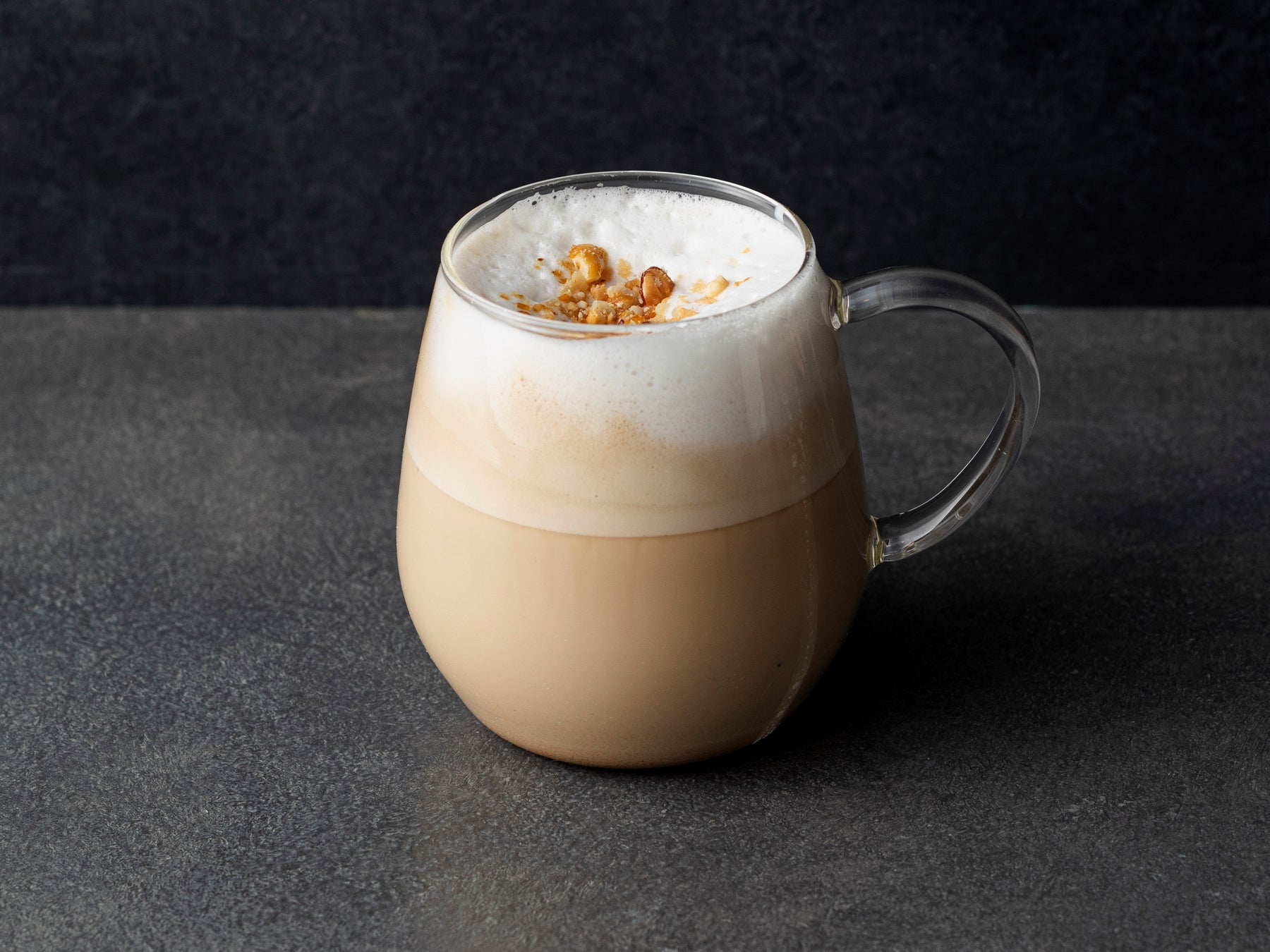 クリーミーな泡の上に、甘くほろ苦いキャラメルシロップと香ばしいナッツをトッピングしたキャラメルラテ。コーヒーは、豆本来の深いアロマと苦味を引き出した自家焙煎豆を使用し、コーヒーの風味とミルクの優しい甘さ、キャラメルの風味が三位一体の美味しさです。