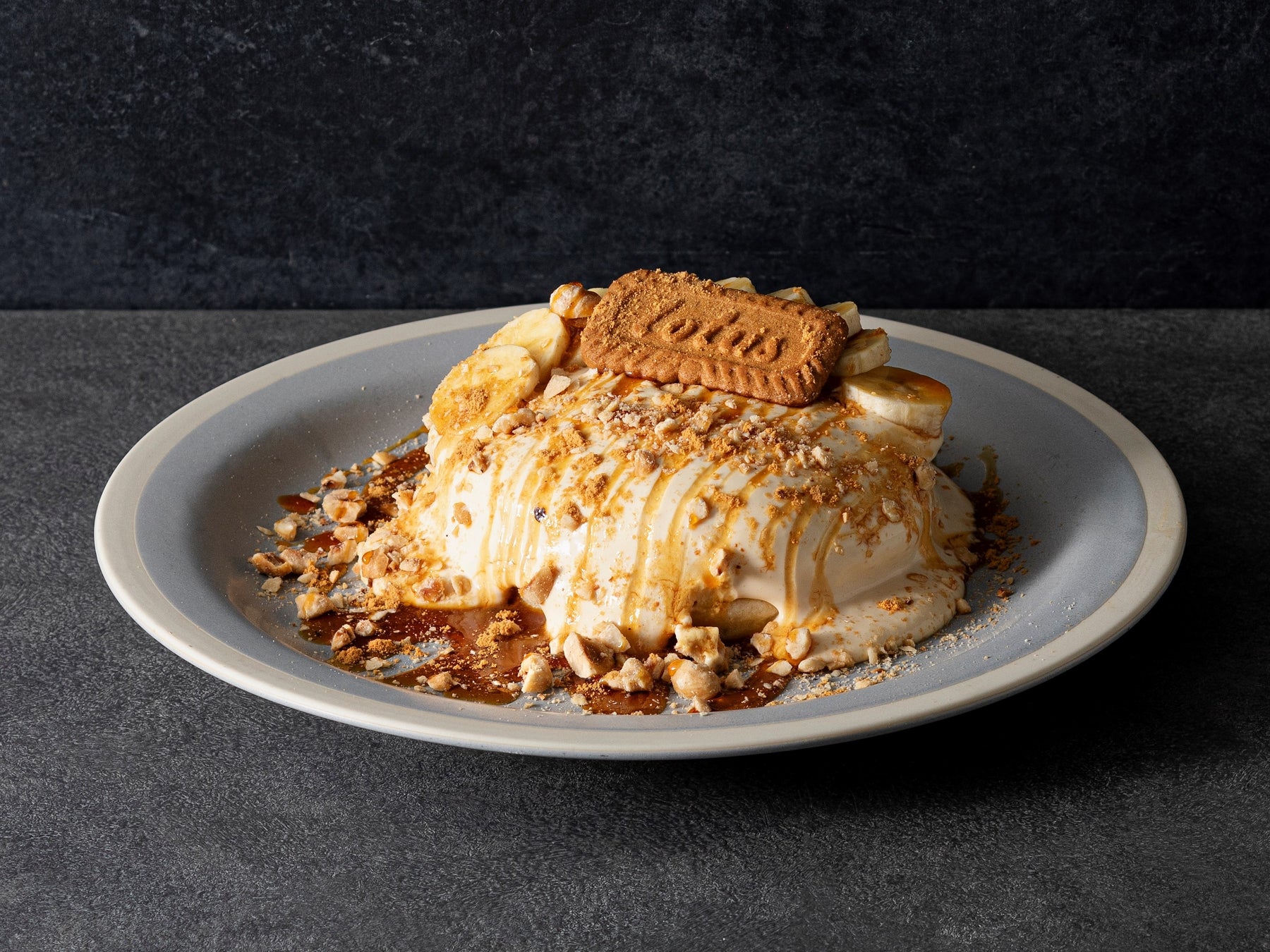 キャラメル味のクリームとソースがたっぷりかかった、幸せパンケーキ!パンケーキを2枚を重ねて、キャラメル風味の生クリームで覆ったインパクト大の一皿です。仕上げに香ばしいキャラメルソース、バナナを添え、トッピングのヘーゼルナッツの食感もアクセントになっています。