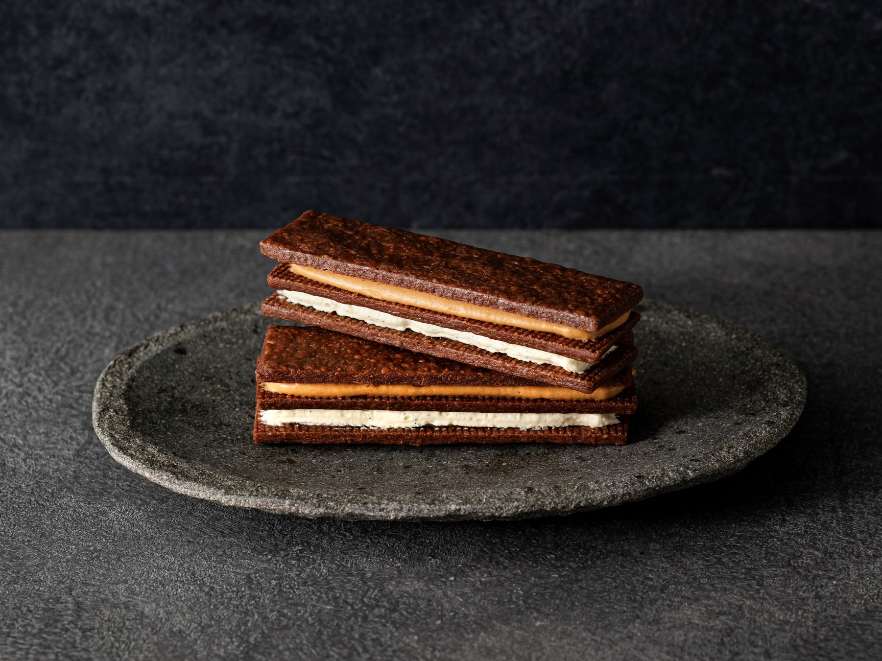 バター香るしっとりサブレで2層のクリームを挟んだ“カサネタ”シリーズの新作は、チョコサブレとキャラメル×塩バニラの、究極マリアージュが楽しめるバターサンド。こっくりほろ苦キャラメルと、塩味が効いた濃厚バニラの組み合わせは、大人の味わい。ティータイムはもちろん、ワインにもよく合います。