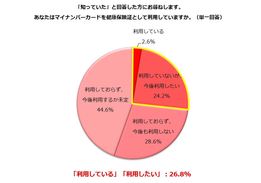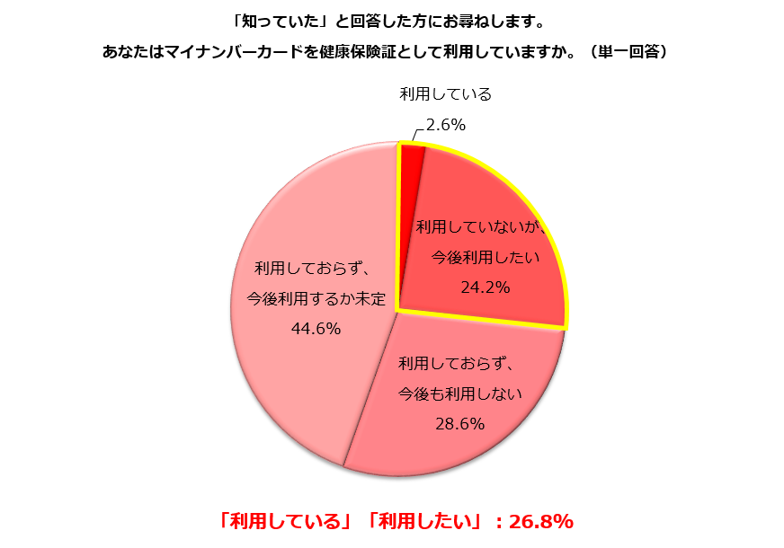 マイナンバーカードの健康保険証利用の本格運用については86.2%が「知っていた」と回答したものの、知っていた人の中で、健康保険証として利用している人は2.6%。今後利用したいと考えている人と合わせても26.8%に留まります。「マイナンバーカードの活用範囲として広げて欲しいものはありますか」との質問には「活用範囲として広げて欲しいものはない」が最も多く45.8%、次いで「自動車などの運転免許証として利用」が29.5%、「資格の証明書として利用」23.7%と続きました。フリーコメントには「マイナンバーカード1つで色んな手続きができて便利」など肯定的な声があった一方、「セキュリティが心配」など安全面などを危惧する声が多く聞かれました。政府はマイナンバーカードの健康保険証利用促進策として、10月から窓口負担額を下げるとしています。しかしながら、今のところは反発の声が上がってからの後追い策になってしまっている感が否めません。マイナンバーカードのさらなる普及には、継続的な加入推進策と同時に、安全性や利便性を高める対応策や理解促進などについて先手を打った対応が必要なのだと思います。