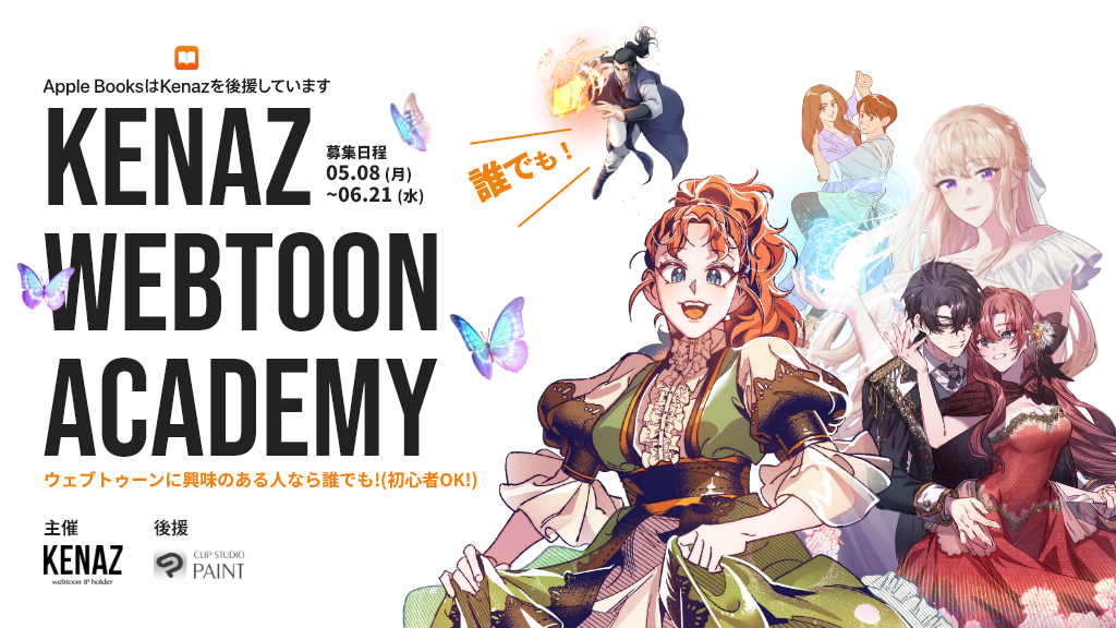 「KENAZ WEBTOONアカデミー」は、数多くのWEBTOON作品を自社スタジオで制作し、様々な配信プラットフォームに作品を提供している株式会社KENAZが主催し、WEBTOONに興味がある方や本格的にデビューを目指している方に向けた、無料のWEBTOON作家育成プログラムです。CLIP STUDIO PAINT を使った8週間のカリキュラムを受講でき、プログラム修了者は、審査を通じてWEBTOON作家デビュークラスに進み、Apple Booksでデビューのチャンスがあります。