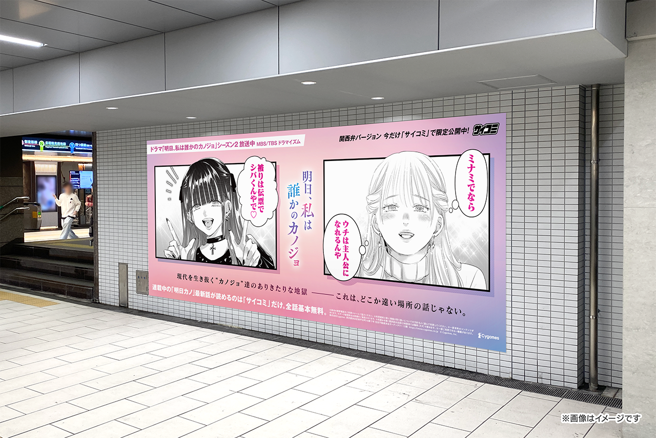 大阪エリアでの交通広告展開と連動して、『明日カノ』漫画本編の関西弁バージョンをマンガ配信サービス「サイコミ」で特別に公開します。期間中、登場人物たちのセリフが関西弁に変換された厳選話を無料で公開。普段の『明日カノ』とは異なる特別な雰囲気をお楽しみください!